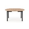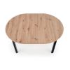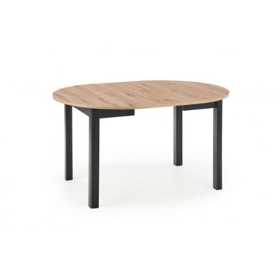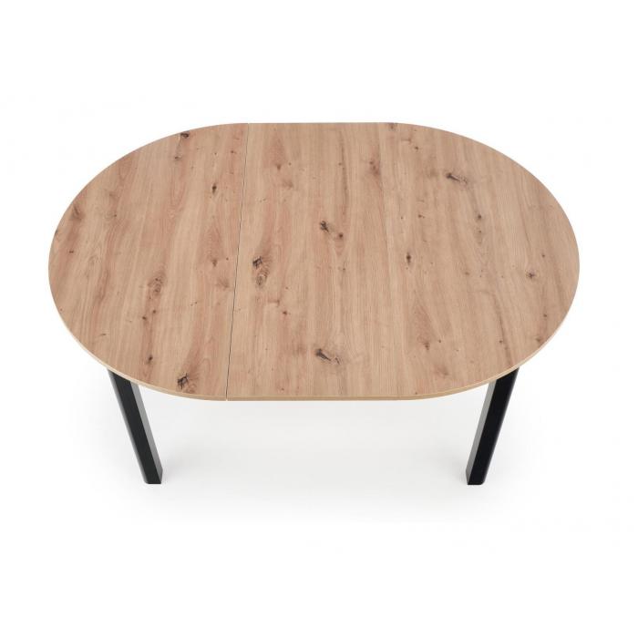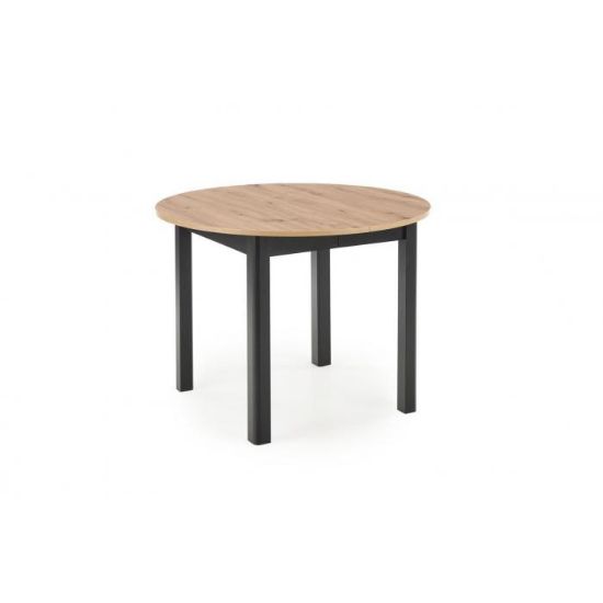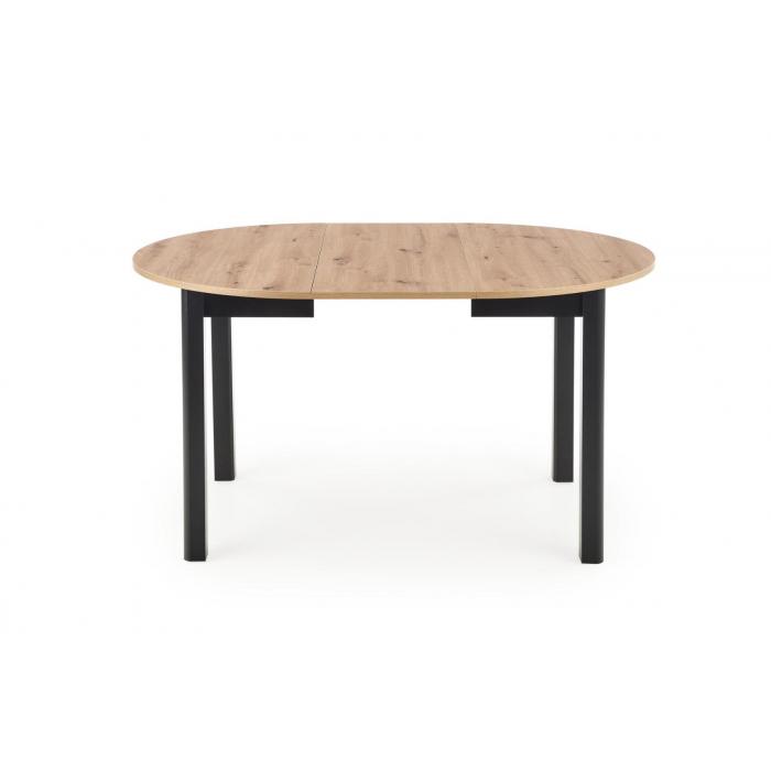 Stół rozkładany, okrągły blat z płyty MDF w wybarwieniu dąb artisan, stabilna czarna podstawa, matowe wykończenie, rozkładany do 142 cm, dla 6 osób, wymaga samodzielnego montażu, elegancki i nowoczesny design.