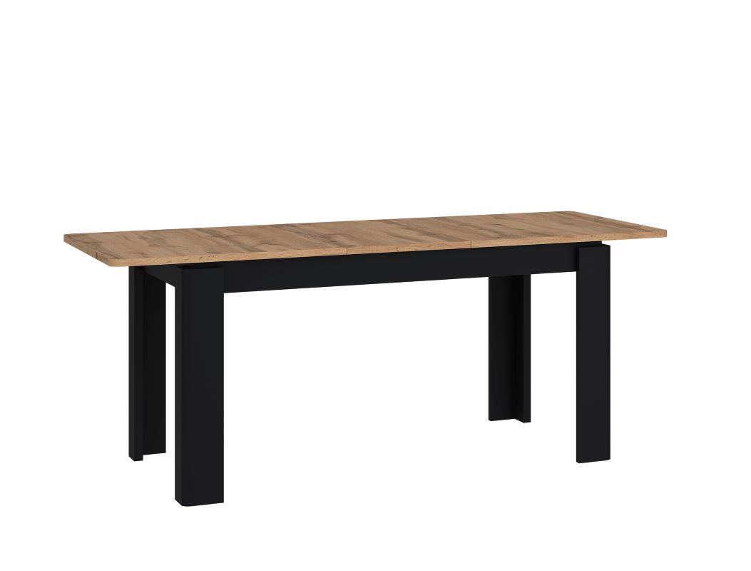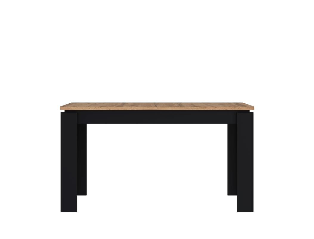Nogi stołu, utrzymane w czarnym matowym kolorze, kontrastują z jasnym blatem, nadając mu nowoczesny i ponadczasowy charakter. Wykonane z płyty wiórowej, zarówno blat, jak i nogi, gwarantują trwałość i stabilność przez wiele lat użytkowania.