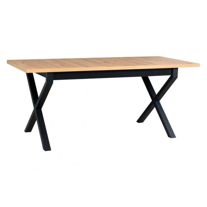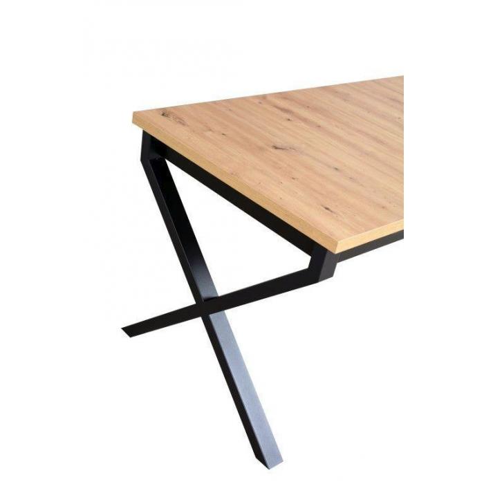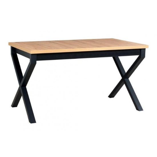 Stół posiada jedną wkładkę o długości 40 cm. Po rozłożeniu całkowita długość to 180 cm. Blat stołu został wykonany z płyty laminowanej w kolorze dąb artisan o matowym wykończeniu, oklejony ABS. Podstawa stołu: skrzynia wykonana z drewna bukowego bejcowana na kolor czarny oraz nogi metalowe malowane na czarno. Produkt do samodzielnego montażu, pakowany w dwie paczki o wymiarach: 1/2. 149x85x14; 2/2. 80x77x15 cm.