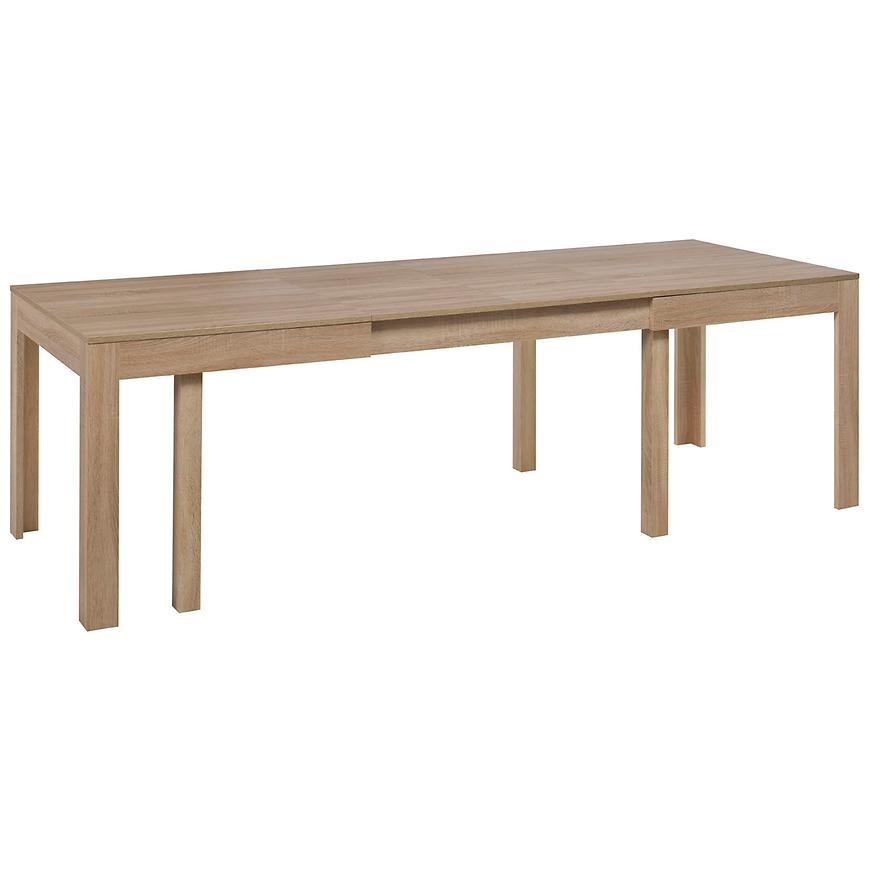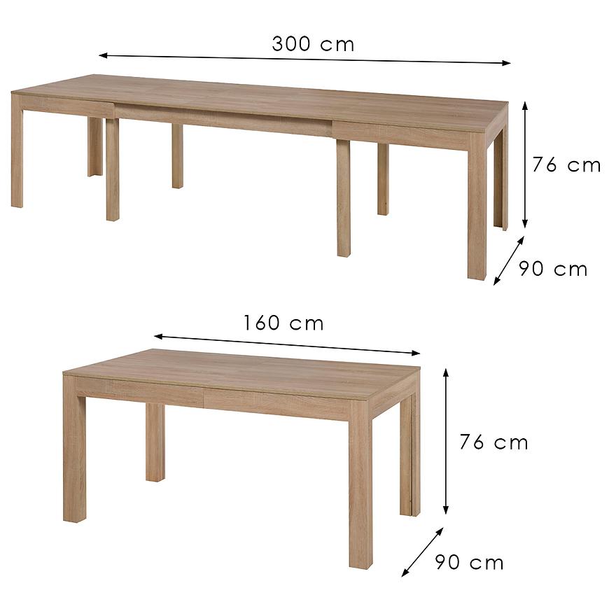 Blat o matowym wykończeniu ma kształt prostokątny i został wykonany z trwałej płyty wiórowej laminowanej, podobnie jak stelaż stołu. Praktyczny mechanizm rozkładania pozwala zwiększyć długość blatu z 160 cm aż do 300 cm, co czyni go doskonałym wyborem zarówno na codzienne posiłki, jak i większe przyjęcia rodzinne.