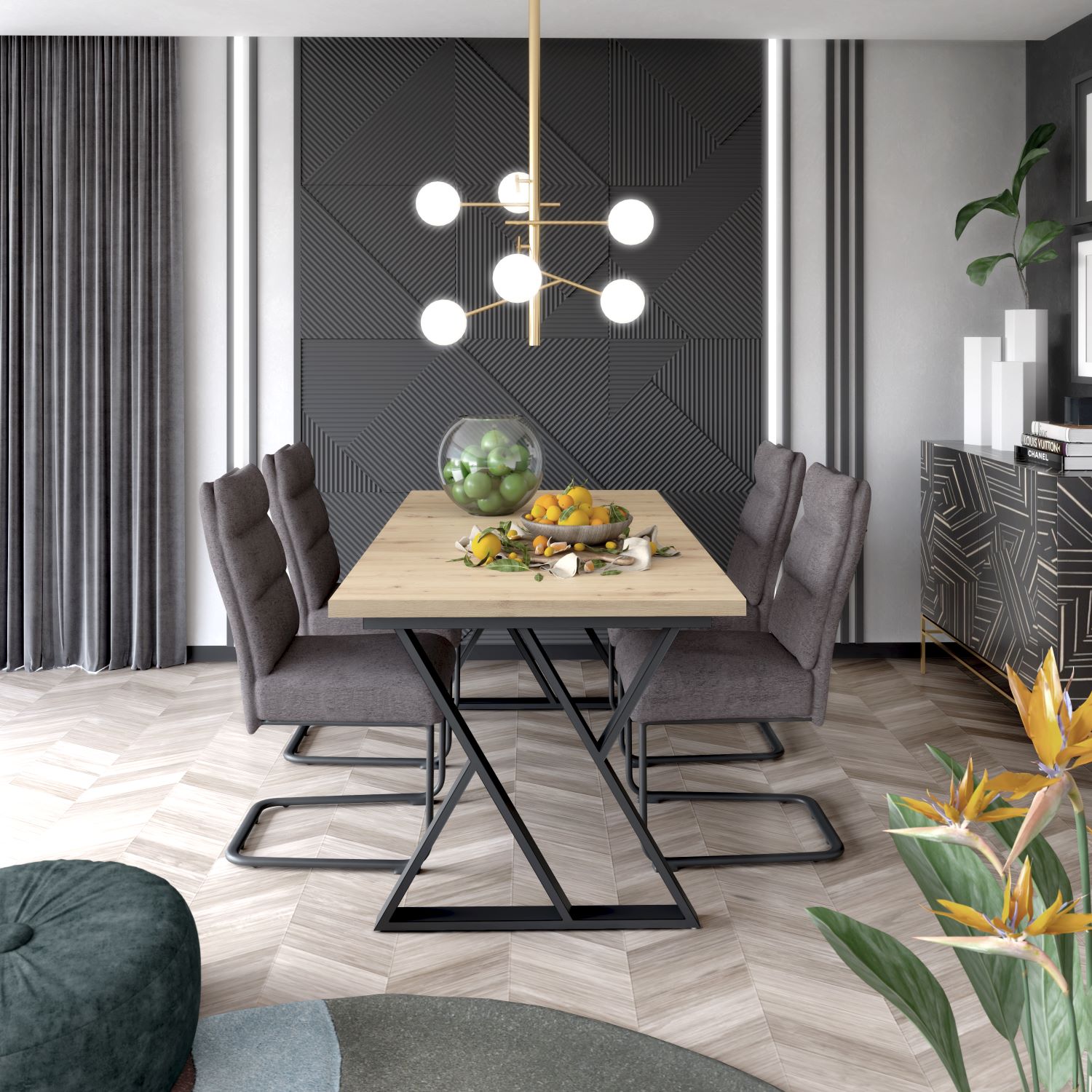 Stół Zeus to doskonałe rozwiązanie dla nowoczesnych wnętrz, w których liczy się zarówno styl, jak i wygoda użytkowania. W wersji podstawowej oferuje powierzchnię 90x160 cm, jednak dzięki dwóm wkładkom przedłużającym (po 40 cm każda), możesz szybko i wygodnie powiększyć blat aż do 240 cm – idealnie na większe spotkania rodzinne lub przyjęcia.