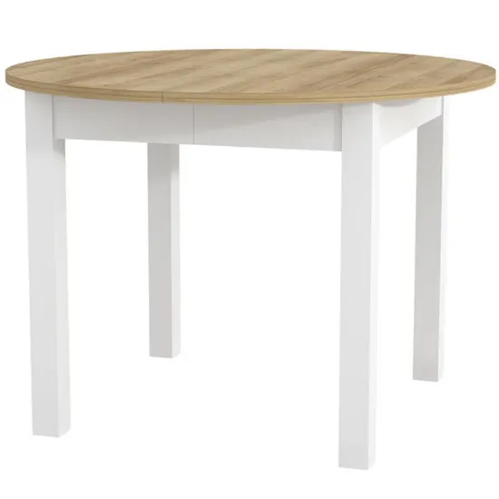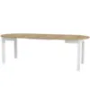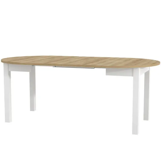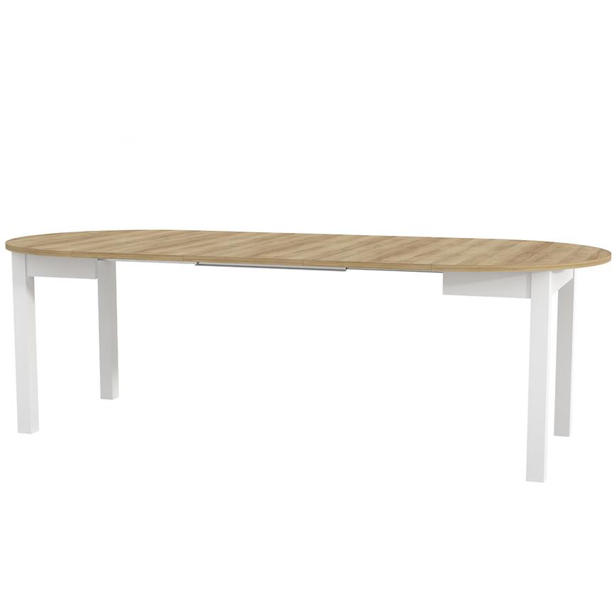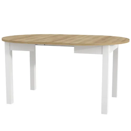 Wykonany z laminowanej płyty wiórowej o matowym wykończeniu, stół Indus prezentuje się elegancko i nowocześnie, a jednocześnie jest odporny na codzienne użytkowanie. Dąb riviera/biały kolor optycznie rozjaśnia wnętrze i świetnie komponuje się z różnymi stylami aranżacyjnymi – od minimalistycznych po skandynawskie.