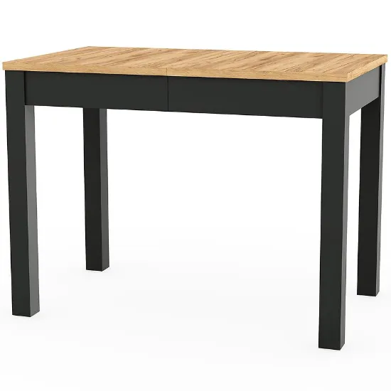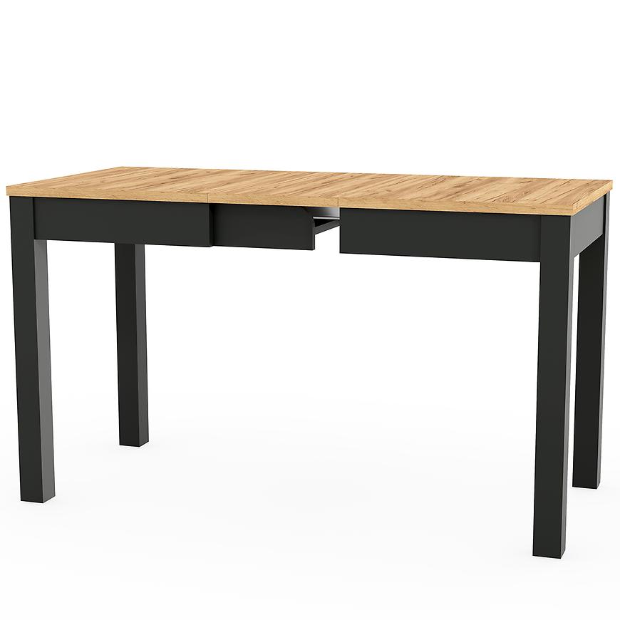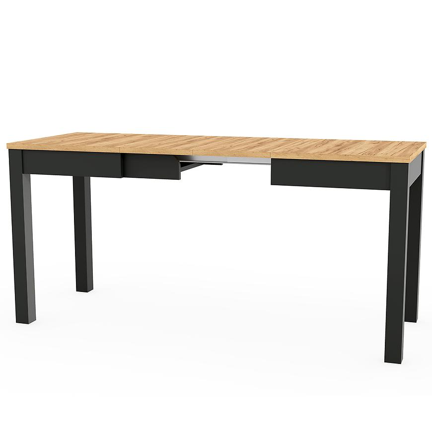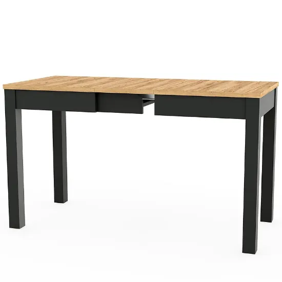 Stół Orion to idealne rozwiązanie do nowoczesnej jadalni lub salonu, gdzie liczy się zarówno estetyka, jak i praktyczność. Wykonany z trwałej płyty wiórowej laminowanej w popularnym kolorze dąb craft/czarny, doskonale wpisuje się w modne, naturalne aranżacje wnętrz. Matowe wykończenie blatu podkreśla elegancki charakter mebla, dodając mu nowoczesnego stylu.