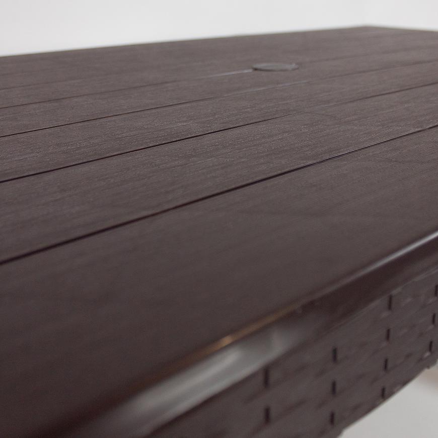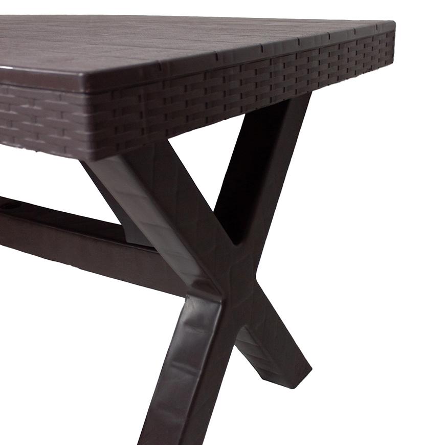 Stelaż stołu wykonany jest z solidnego plastiku w kolorze brązowym, nadając mu rustykalny i elegancki wygląd. Podobnie jak blat, wykonany z wysokiej jakości plastiku, stelaż zapewnia trwałość i odporność na warunki atmosferyczne.