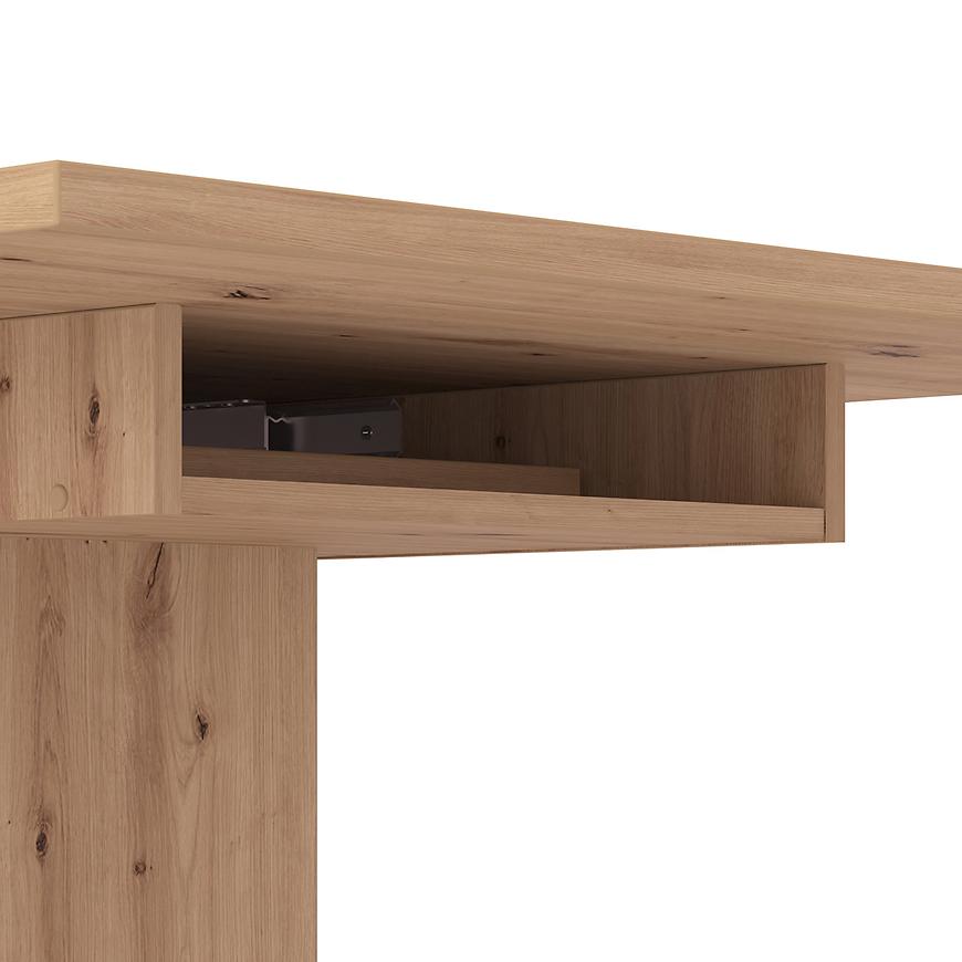 Wykonany z trwałych materiałów – stelaż oraz blat z laminowanej płyty wiórowej – gwarantuje stabilność i odporność na codzienne użytkowanie. Matowe wykończenie w eleganckim, dąb artisan kolorze nadaje całości nowoczesny i lekki charakter, który świetnie wpisuje się w aranżacje w stylu minimalistycznym, skandynawskim czy loftowym.