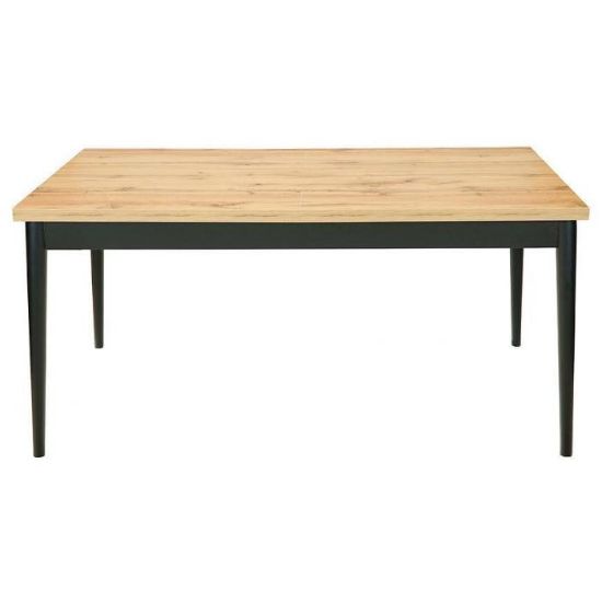 Rozkładany prostokątny stół dla 6-8 osób, matowy blat laminowany, solidny drewniany stelaż, nowoczesne połączenie dąb wotan/czarny, wymaga samodzielnego montażu, idealny do jadalni i kuchni.