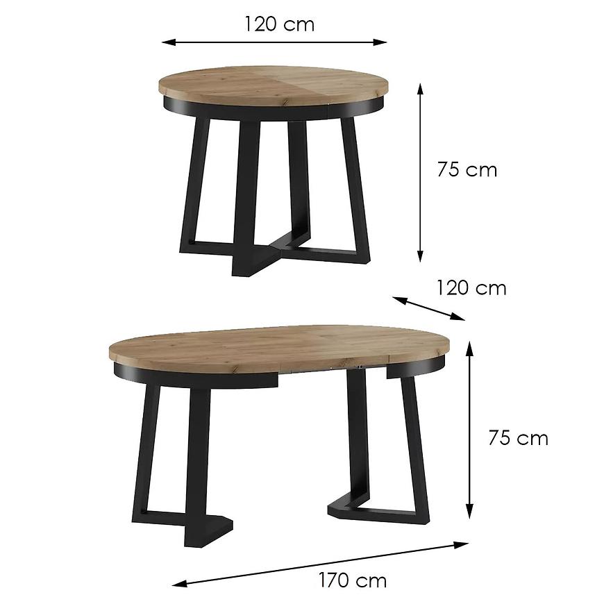 Blat stołu, wykonany z wysokiej jakości płyty wiórowej laminowanej, posiada okrągły kształt i matowe wykończenie, co nadaje mu elegancji i sprawia, że jest łatwy w pielęgnacji. Dzięki funkcji rozkładania, początkowo kompaktowe wymiary (120 cm szerokości przed rozłożeniem) rozszerzają się do 170 cm, oferując dodatkowe miejsce dla gości i umożliwiając swobodne aranżowanie przestrzeni.