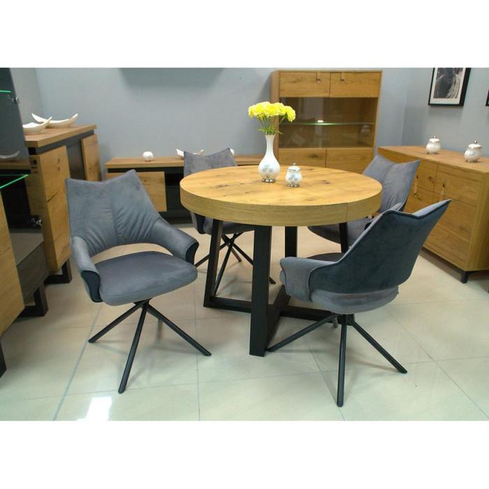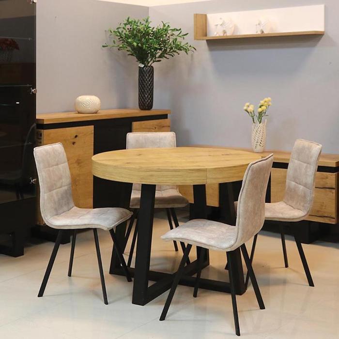 Stół St-971 100+2x50 to idealne rozwiązanie dla osób szukających funkcjonalnego stołu do jadalni lub kuchni. Okrągły blat sprzyja wspólnym posiłkom i rozmowom, a możliwość rozłożenia stołu do 200 cm pozwala wygodnie pomieścić 8 osób. Naturalny odcień dębu sękatego wprowadza ciepło i charakter do wnętrza.