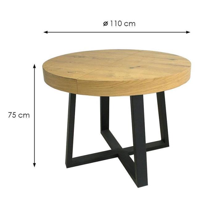 Okrągły stół rozkładany dla 8 osób, blat z płyty meblowej, matowe wykończenie, metalowy stelaż, kolor dąb sękaty, elegancki i funkcjonalny, wymaga samodzielnego montażu, idealny do jadalni i kuchni w stylu nowoczesnym i rustykalnym.
