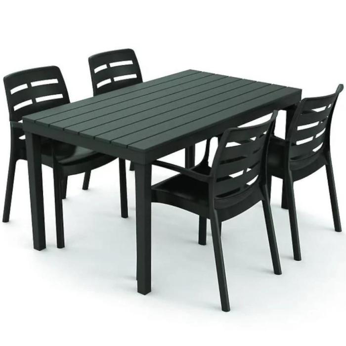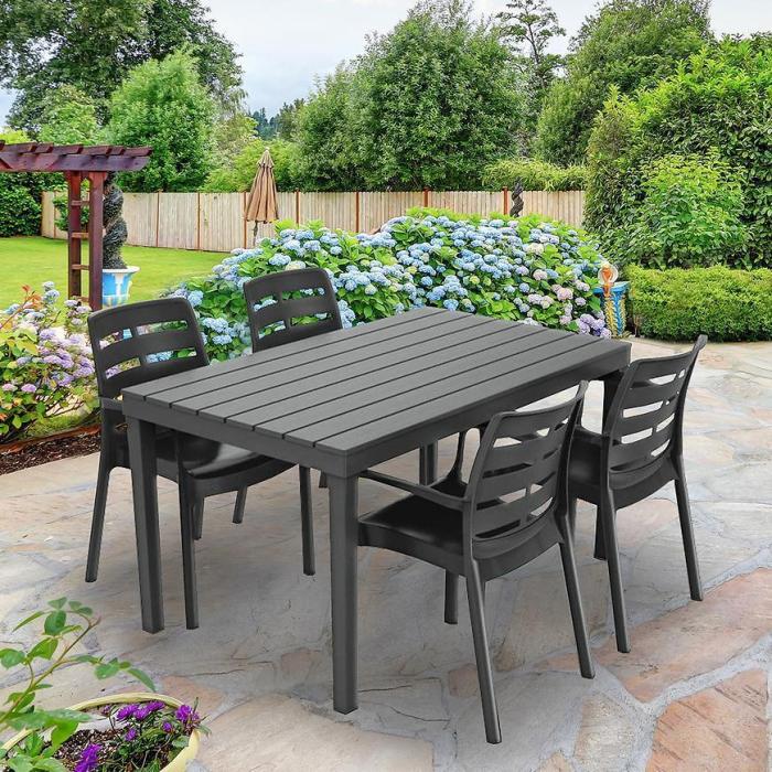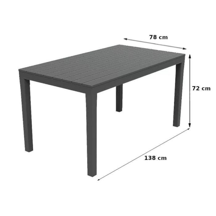 Stół obiadowy Sumatra to stół, który idealnie wpasuje się w design ogrodu, balkonu czy tarasu. Wykorzystany materiał to wysokiej jakości plastik, co sprawia, że jest solidny i wytrzymały. Odporny na promieniowanie UV i niekorzystne warunki atmosferyczne. Dodatkowy efekt wizualny nadaje imitacja deski na blacie w stylu polywood oraz uniwersalne kolory. Stół posiada wyjmowane nogi.