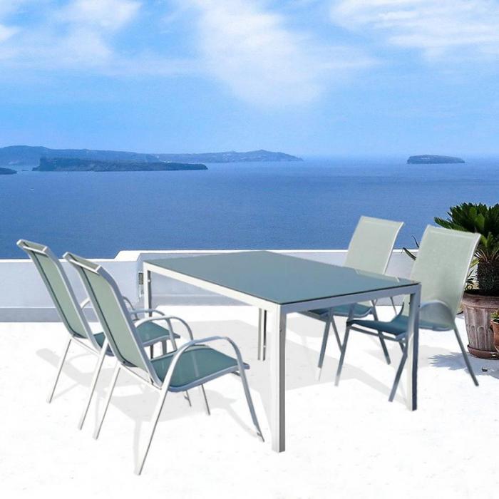 Elegancki stół ze szklanym blatem będzie pasował na niejeden taras lub ogród. Rama metalowa malowana proszkowo oraz blat malowany na matowy perłowy kolor dają ciekawy design. Blat stołu wykonany jest ze szkła hartowanego, które jest wytrzymalsze na uszkodzenia.
