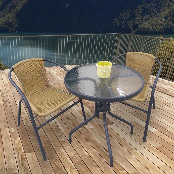 Stolik bistro z blatem ze szkła hartowanego jest solidny i wielosezonowy. Idealnie wpasuje się w wystrój każdego balkonu, tarasu czy ogrodu. Metalowe nogi są wzmacniane okrągłym kołem plastikowym, a na końcach posiadają antypoślizgowe nakładki. Montaż jest bardzo łatwy i szybki: wystarczy włożyć nogi w tłoczone otwory pod blatem i zamontować kółko.