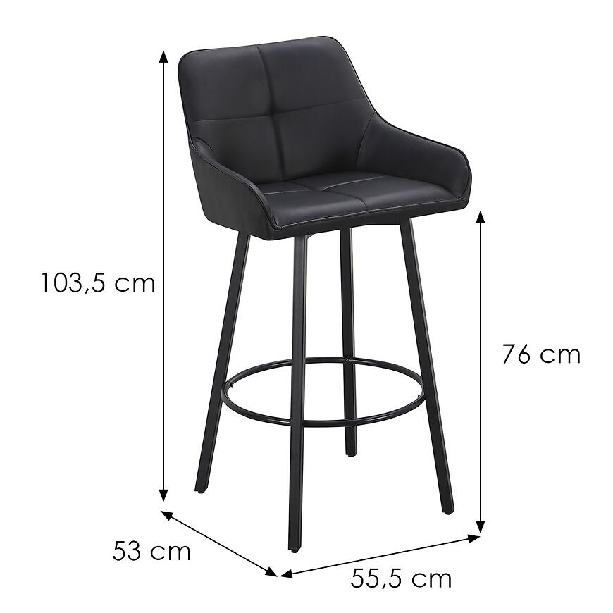 Stołek wyposażono w wygodne siedzisko z ekoskóry, które zapewnia komfort podczas dłuższego siedzenia. Maksymalna wysokość stołka wynosi 103,5 cm, a wysokość do siedziska 76 cm, co pozwala dopasować mebel do różnych blatów barowych i wysp kuchennych.