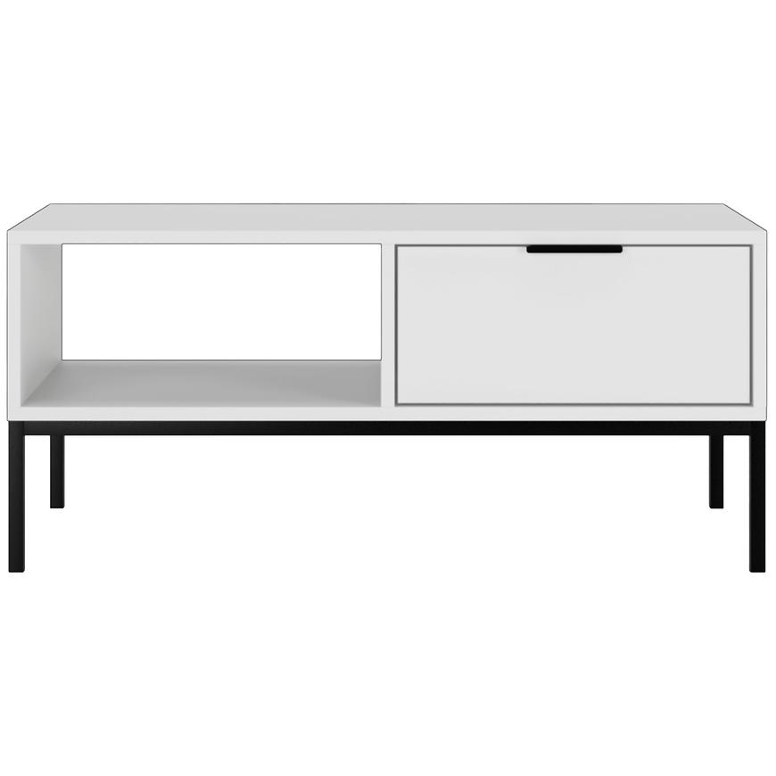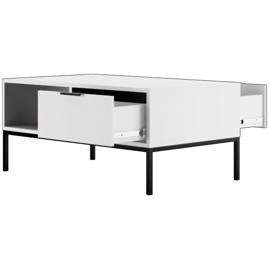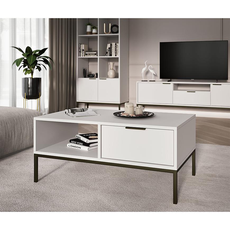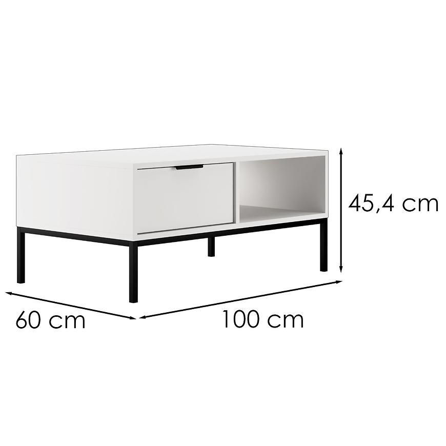 Stolik 100 Austin biały/czarny to nowoczesny mebel o prostokątnym, matowym blacie, idealny do salonu lub pokoju dziennego. Blat o długości 100 cm wykonano z trwałej płyty wiórowej laminowanej, a stabilny czarny stelaż z metalu podkreśla jego loftowy charakter. Stolik nie jest rozkładany ani regulowany, co zapewnia stabilność i prostotę użytkowania. Połączenie bieli i czerni świetnie wpisuje się w nowoczesne aranżacje. Mebel wymaga złożenia.