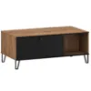 Blat wykonano z płyty wiórowej laminowanej, odpornej na codzienne użytkowanie i łatwej w utrzymaniu czystości. Matowe wykończenie blatu nadaje stolikowi elegancji i subtelnie podkreśla naturalny charakter drewna, dzięki czemu stolik wpisuje się w nowoczesne i minimalistyczne wnętrza.