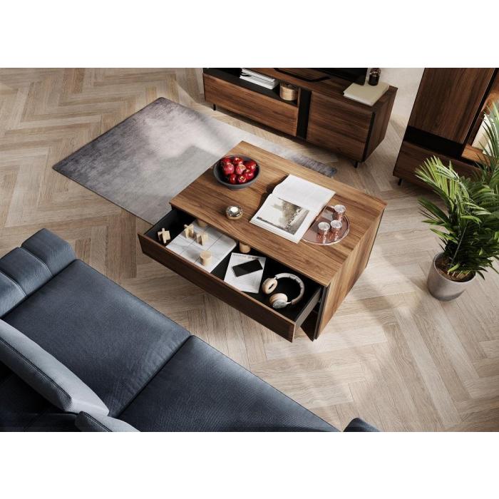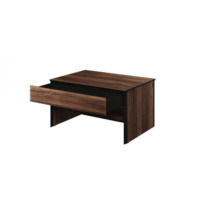 Nowoczesny i elegancki stolik kawowy idealnie sprawdzi się we współczesnych salonach. Pod blatem kryje się wygodna i pojemna szuflada, w której możesz przechować piloty, czasopisma i inne często używane drobiazgi. Poniżej znajduje się dodatkowa półka.