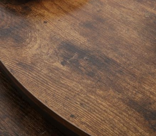 Blaty stolików wykonane są z płyty laminowanej o wybarwieniu rustykalnego brązu, co nadaje im charakterystyczny, ciepły wygląd. Materiał ten nie tylko dodaje elegancji, ale także gwarantuje łatwość w utrzymaniu czystości i trwałość. Stelaż wykonany z metalu, pomalowany proszkowo na matowy, głęboki kolor czarny, stanowi solidne fundamenty dla blatu. Odporność na uszkodzenia i łatwość w utrzymaniu czystości sprawiają, że stolik Fendi to inwestycja na lata.