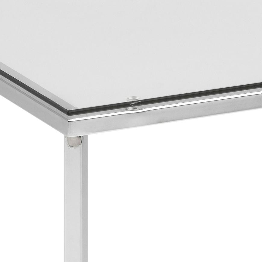 Stelaż z metalu w białym wybarwieniu zapewnia solidną podstawę, gwarantując stabilność i trwałość. Dzięki swojej kompaktowej wielkości (45 cm wysokości, 50 cm szerokości i długości), stolik glass sprawdzi się doskonale w salonach, sypialniach czy biurach. Jego nowoczesny design pasuje do różnorodnych aranżacji, wnosząc do wnętrza subtelną elegancję.