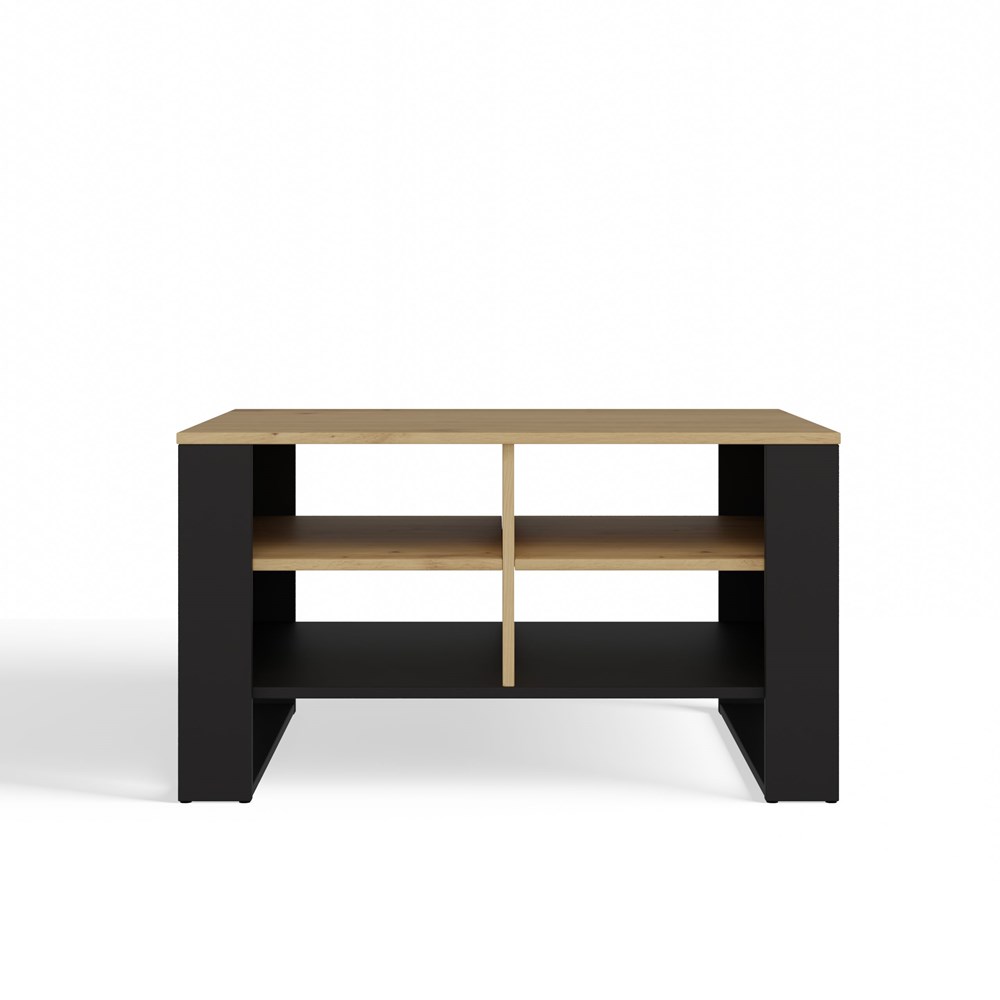 Innowacyjny design stolika podkreślają modne kolory – połączenie ciepłego odcienia dębu artisan z czarnymi detalami tworzy harmonijny kontrast, który dodaje meblowi nowoczesnego, stylowego wyglądu. Ten subtelny, lecz wyrazisty akcent sprawia, że stolik staje się centralnym punktem aranżacji wnętrza.