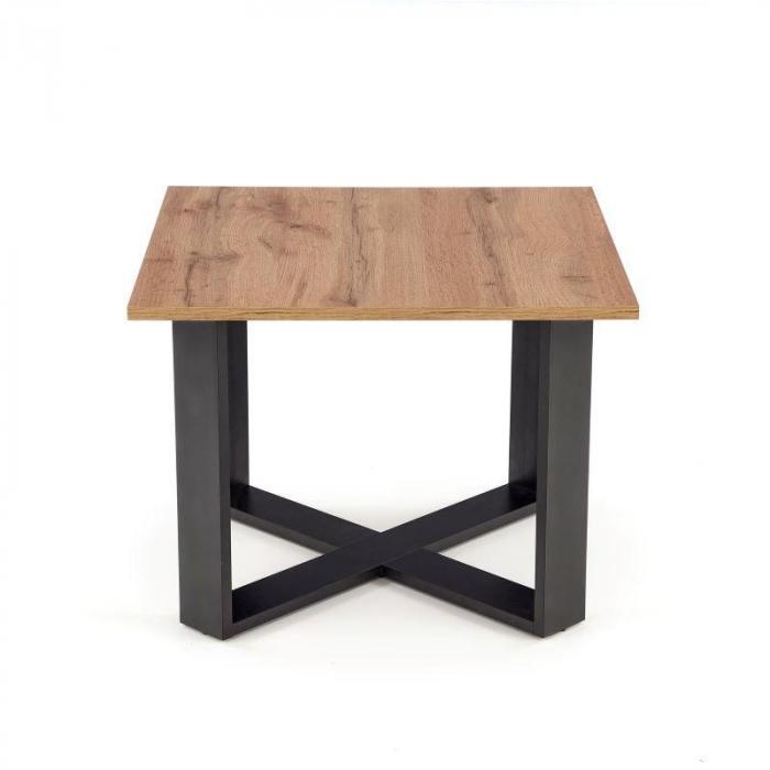 Stolik kawowy Alti z blatem w kolorze dąb wotan. Podstawę stanowi czarny stelaż, w którym cztery prostokątne nogi przeplatają się i łączą. Taki układ nie tylko świetnie się prezentuje, ale i zapewnia stabilność całej konstrukcji. Wysokiej jakości płyta meblowa, z której wykonano kwadratowy blat zapewnia dużą radość z użytkowania.
