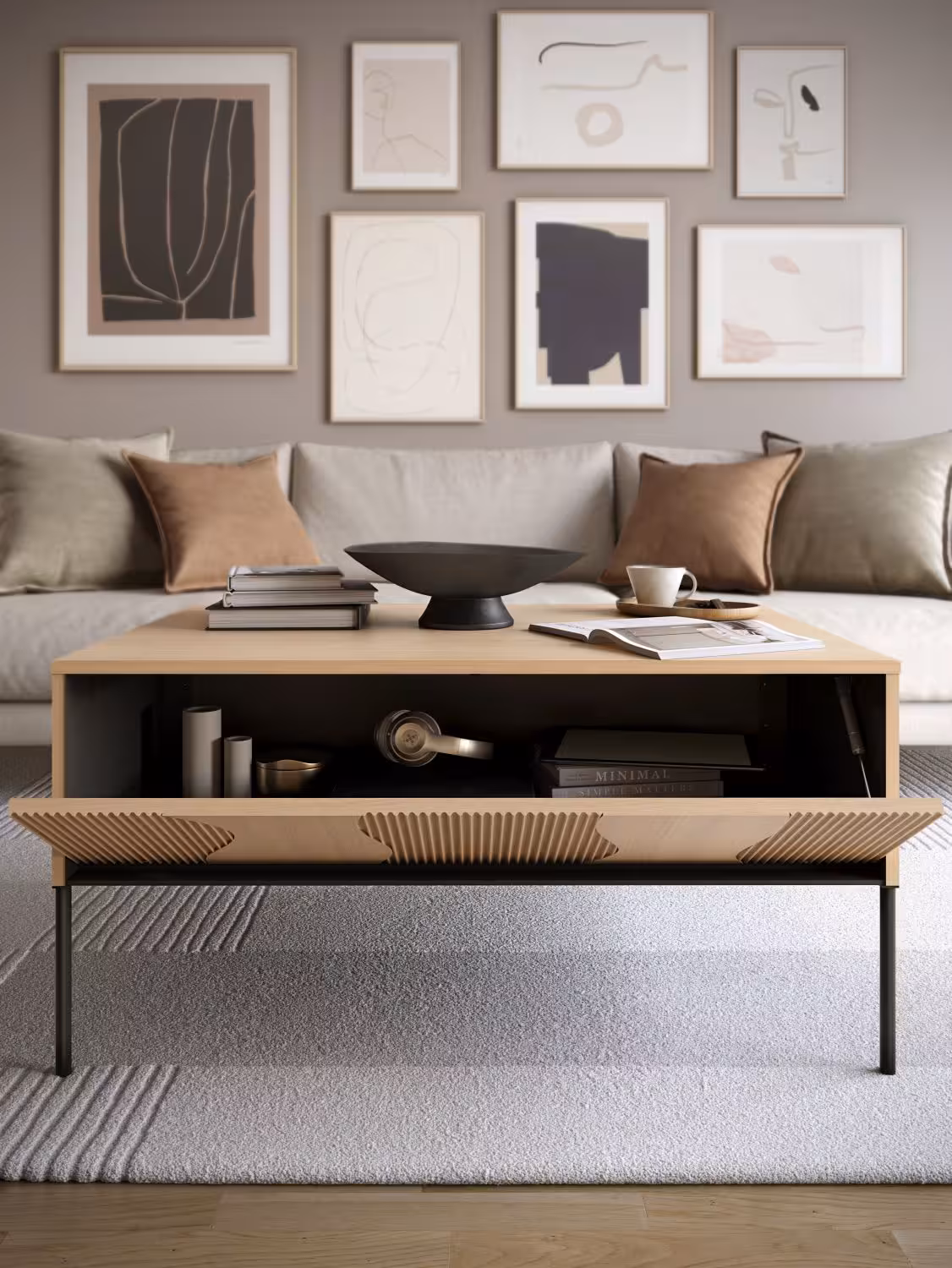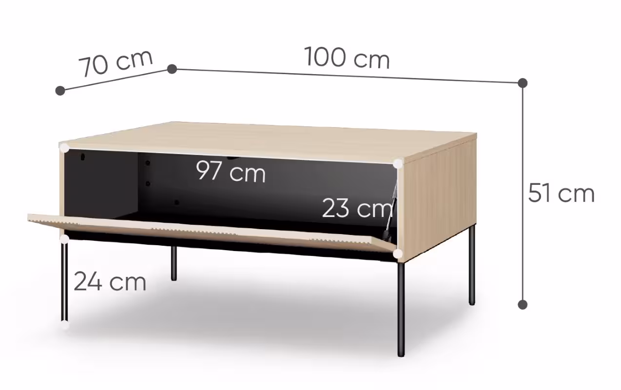 Pod blatem stolika znajduje się zamykana półka, która umożliwia dyskretne przechowywanie drobnych przedmiotów, takich jak piloty, czasopisma czy drobne akcesoria. Dzięki temu powierzchnia blatu pozostaje wolna i uporządkowana.