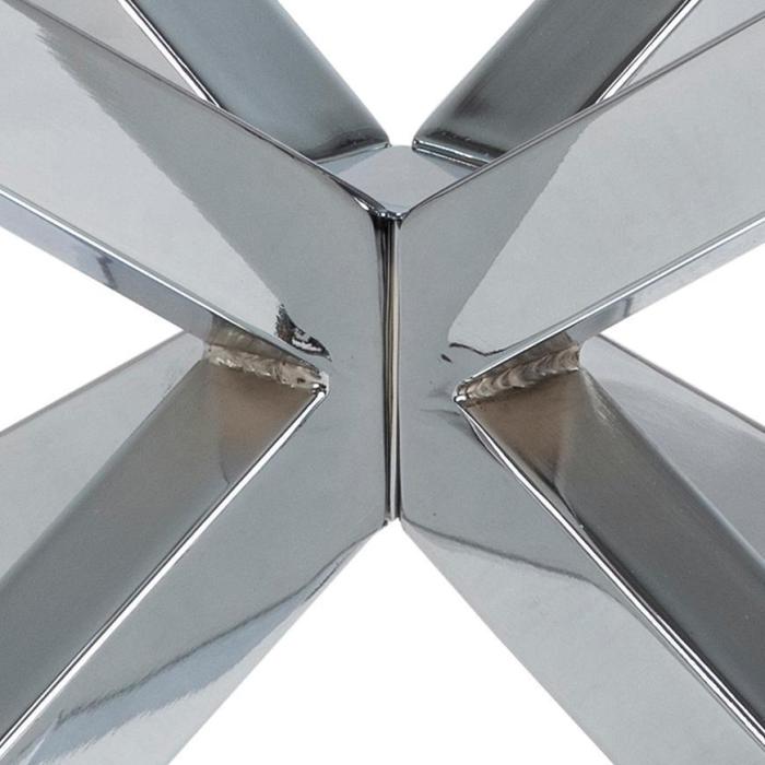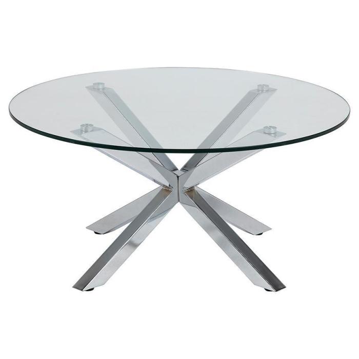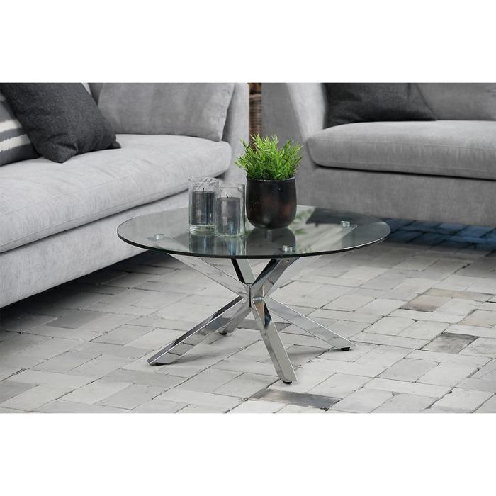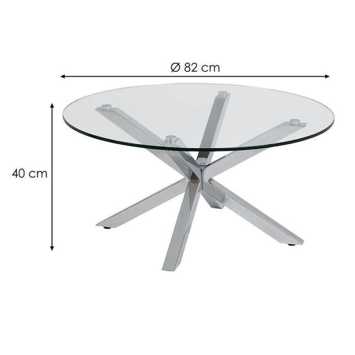 Stolik został wykonany ze szkła oraz metalowym stelażu w kolorze chromowany metal.