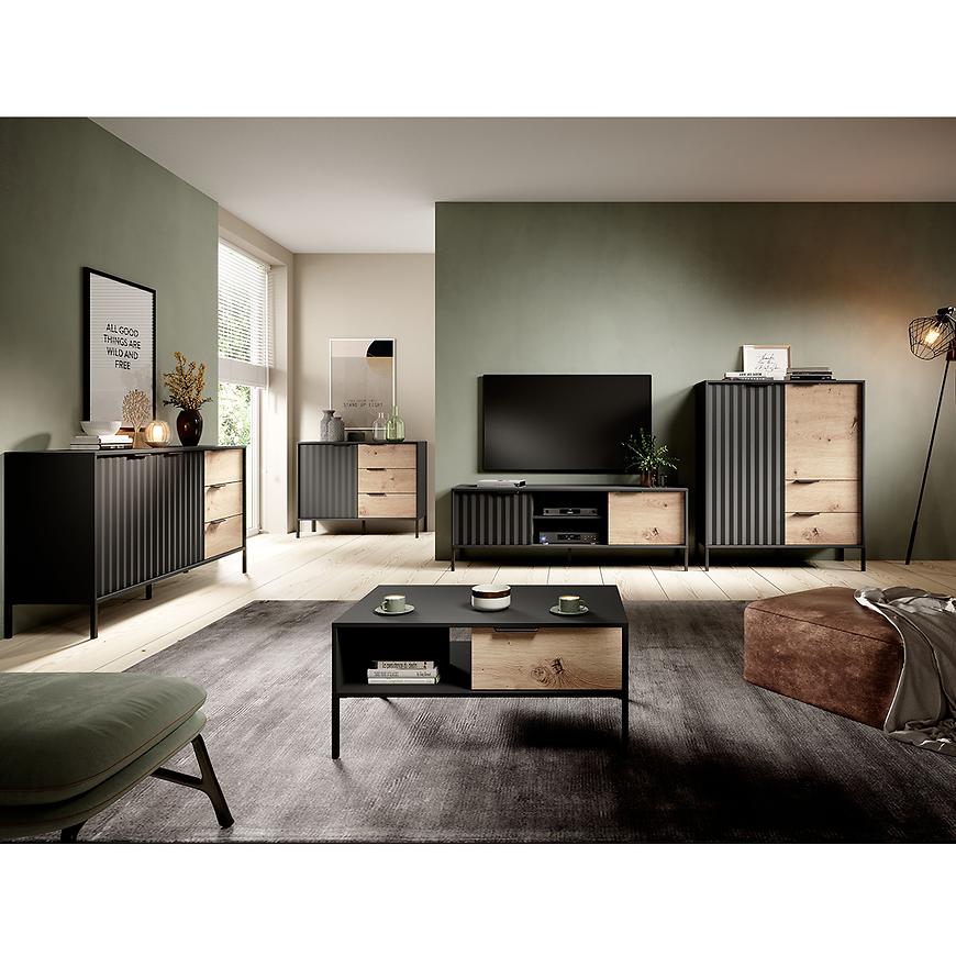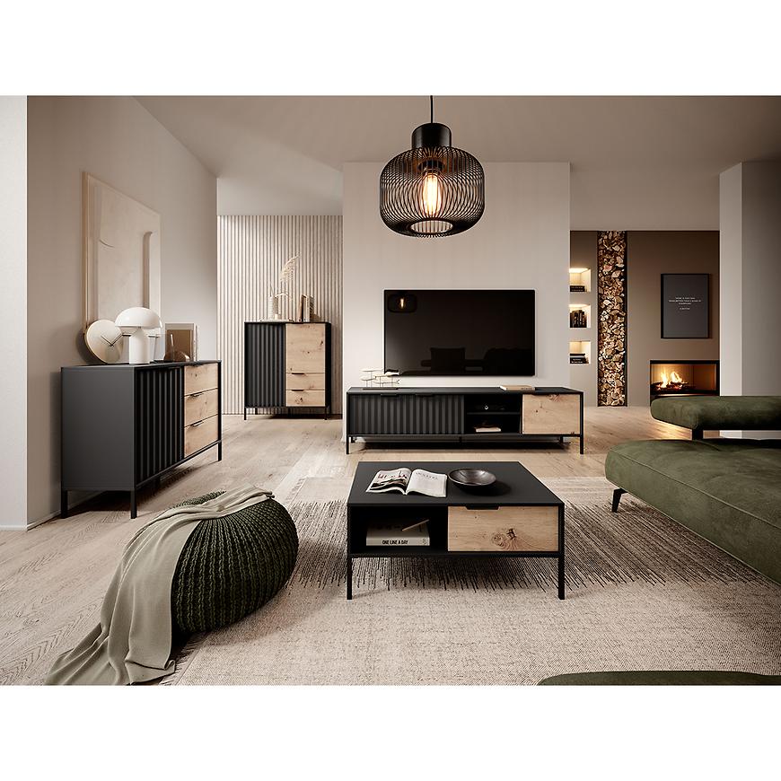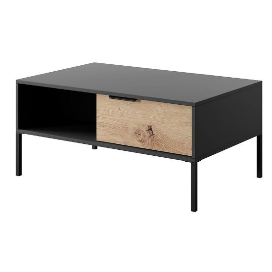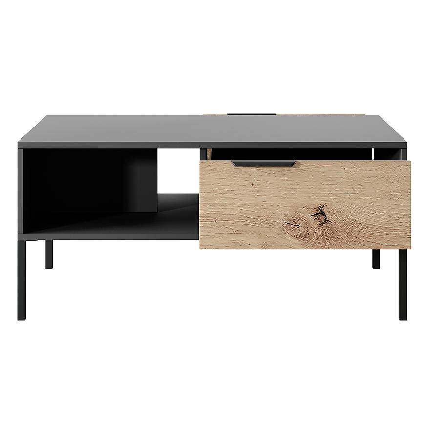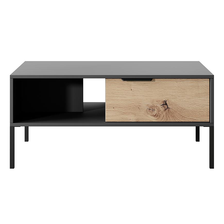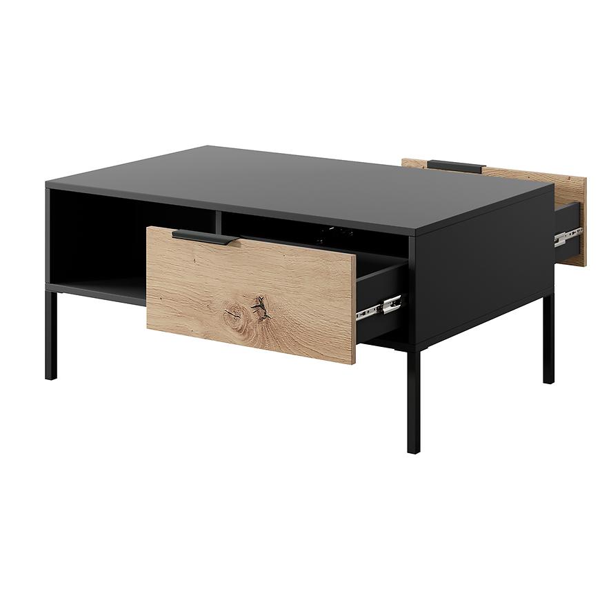 Stolik kawowy RAVE w kolorze czarny/dąb artisan to doskonałe połączenie funkcjonalności, elegancji i nowoczesnego stylu. Wykonany z trwałych materiałów, takich jak płyta wiórowa laminowana o matowym wykończeniu blatu oraz metalowy stelaż, ten stolik zapewnia nie tylko wyjątkowy wygląd, ale także długotrwałą trwałość.