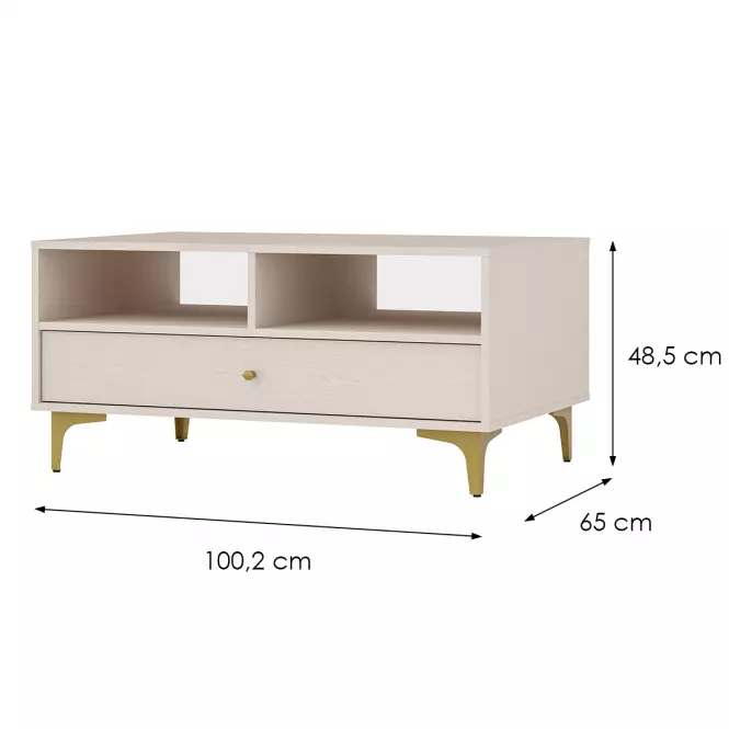 Stolik kawowy Tokyo 1 1S w kolorze beż piaskowy to elegancki i funkcjonalny element wyposażenia wnętrza, który wyróżnia się nowoczesnym stylem i praktycznym designem. Wykonany z wysokiej jakości materiałów, doskonale wpisuje się w modne aranżacje. Blat stolika, wykończony w matowym kolorze, został wykonany z trwałej płyty wiórowej laminowanej, co zapewnia odporność na codzienne użytkowanie oraz łatwość w utrzymaniu czystości.