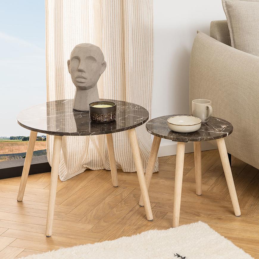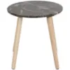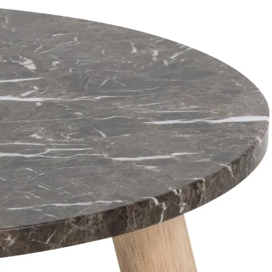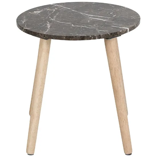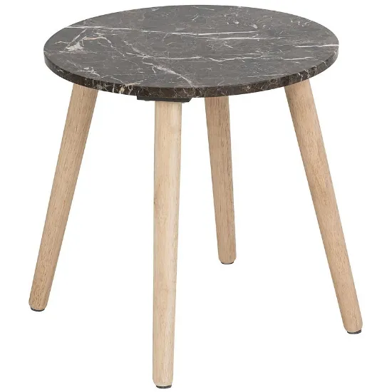 Blat o średnicy 40 cm i wysokości 40,5 cm wykonany jest z marmuru o matowym wykończeniu, co nadaje mu subtelnej elegancji. Okrągły kształt zapewnia wygodę użytkowania, a stabilna drewniana konstrukcja gwarantuje trwałość i solidność.