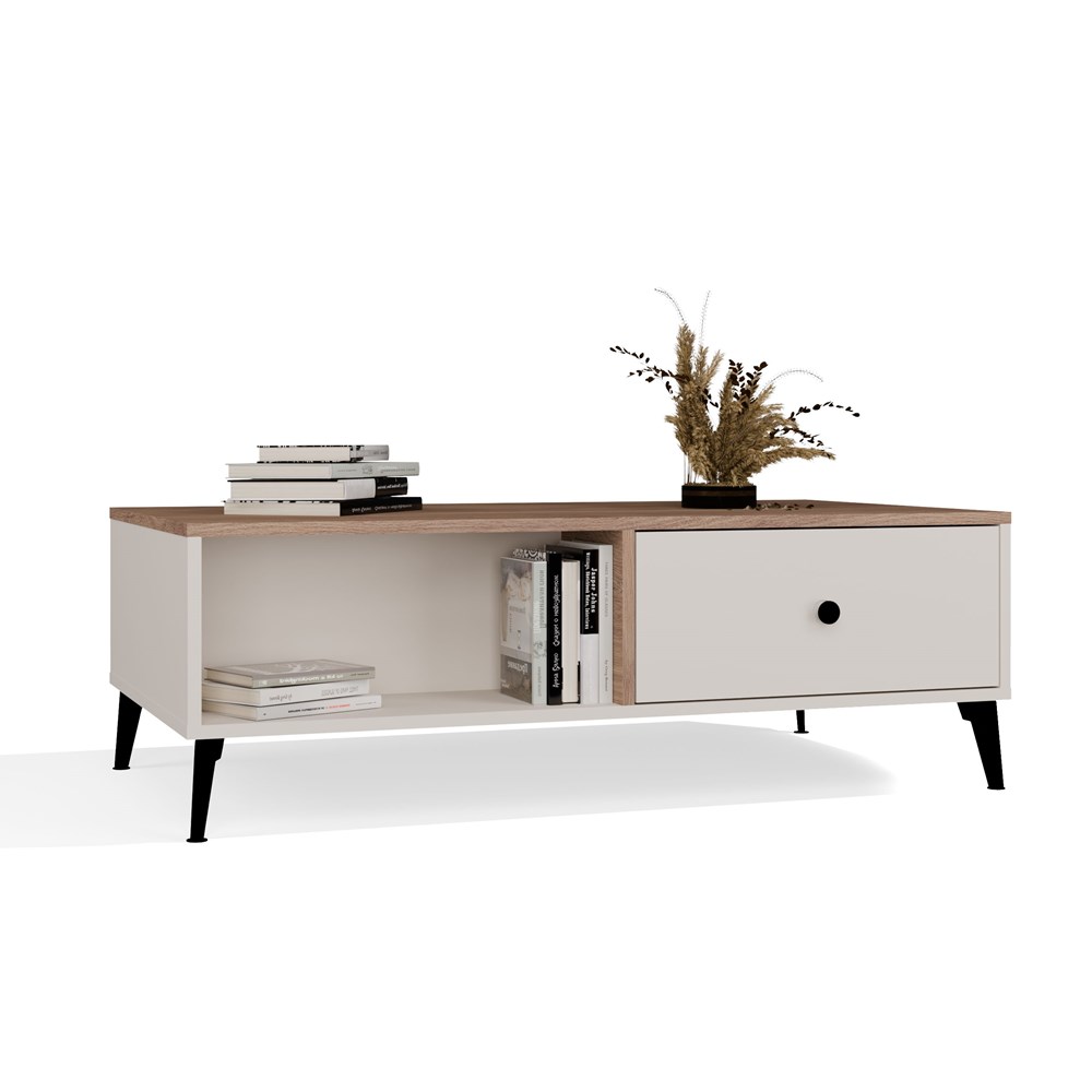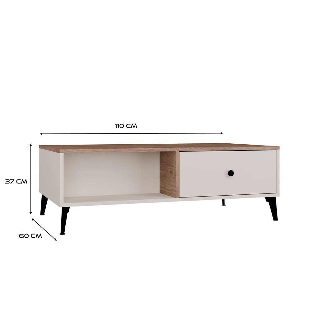 Wygląd stolika podkreślają czarne, gałkowe uchwyty oraz smukłe metalowe nóżki o wysokości 12 cm. Kontrastujące akcenty dodają konstrukcji lekkości i nowoczesnego charakteru. Dzięki podwyższonej podstawie sprzątanie pod meblem staje się wygodne, a cały stolik wygląda bardziej przestrzennie i finezyjnie. Połączenie beżowych frontów z wyraźną strukturą drewna tworzy estetyczny efekt, który podkreśla naturalny klimat wnętrza, wprowadzając wrażenie harmonii i uporządkowania. To idealna propozycja do salonów urządzonych w stylu skandynawskim, minimalistycznym lub nowoczesnym.