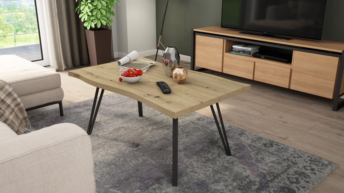 Efektowne krawędzie LIVE GRAIN. Jednym z najbardziej charakterystycznych elementów stolika Lenny są krawędzie na krótkich bokach blatu z obrzeżem LIVE GRAIN. To innowacyjne rozwiązanie sprawia, że cały blat wygląda jak precyzyjnie wycięty kawałek litego drewna. Ta subtelna, naturalna struktura dodaje elegancji i przytulności, jednocześnie podkreślając nowoczesny charakter mebla.