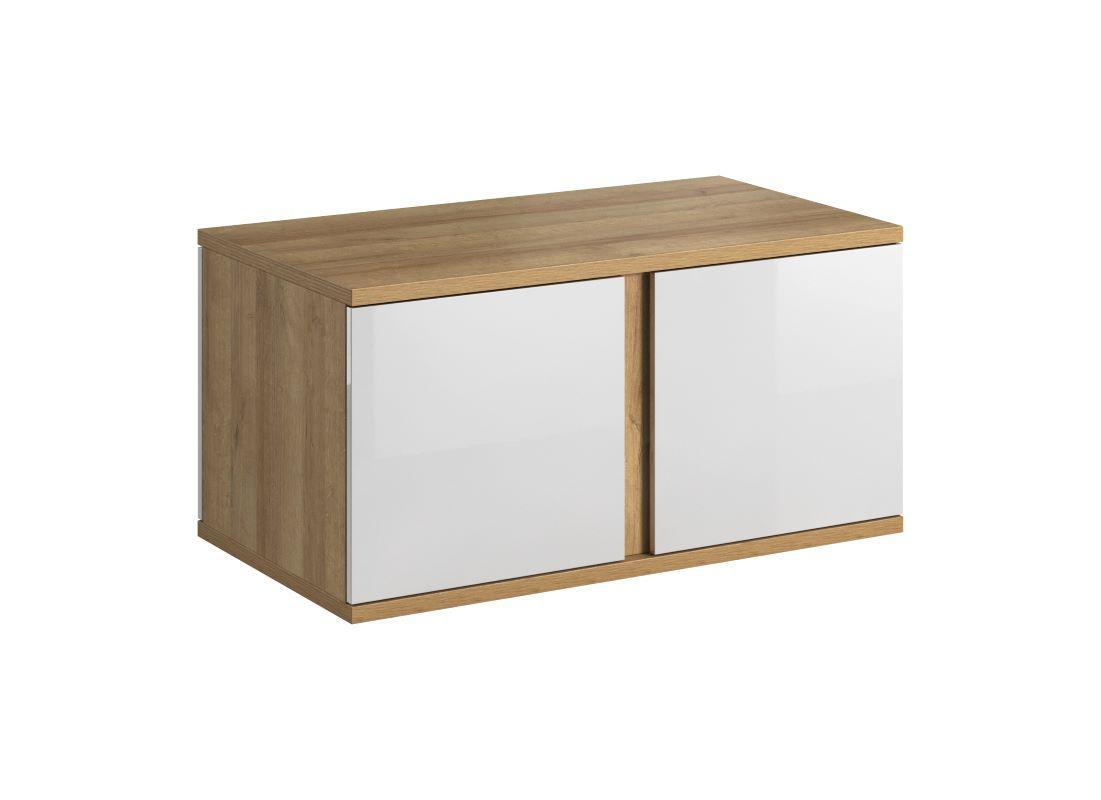 Za białymi frontami stolika Massimo ukryte jest pojemne miejsce do przechowywania drobiazgów. Korpus stolik wykonany jest z płyty laminowanej w kolorze dąb rivia, białe fronty wykonane są z płyty MDF z połyskiem.