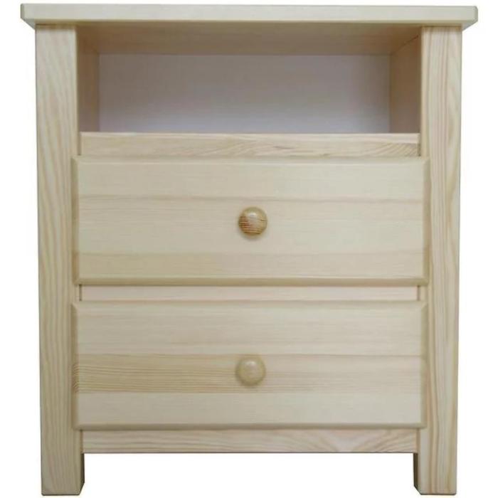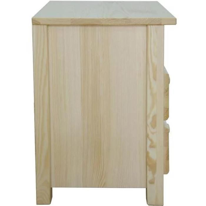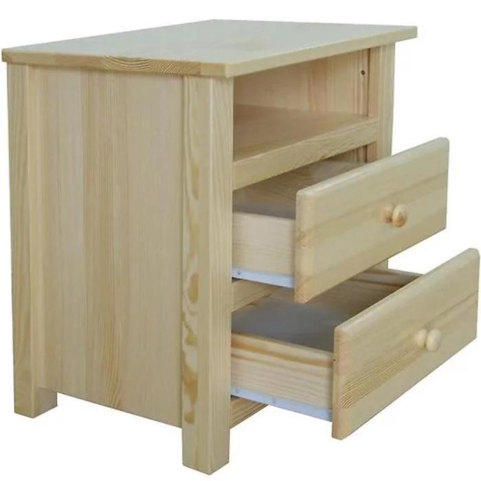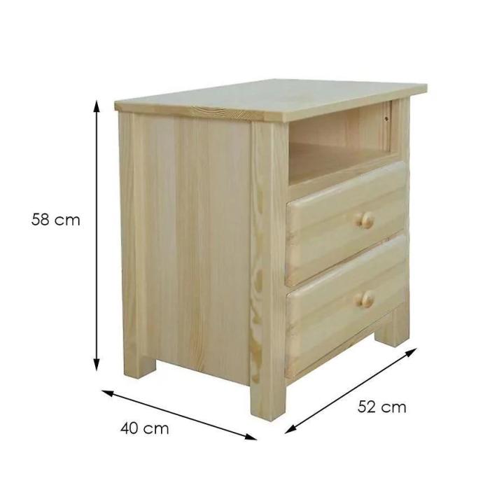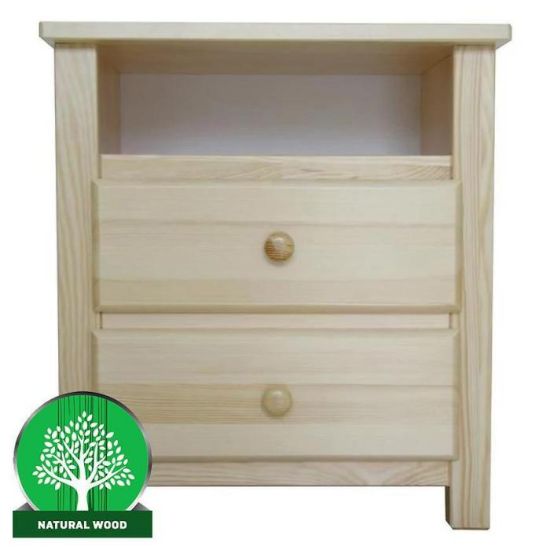 Konstrukcja szafki jest stabilna i wytrzymała. Materiał wykonania to drewno w kolorze sosny. Szafka z pewnością znajdzie swoje zastosowanie w sypialni, ale również w salonie pełniąc rolę małego stolika.