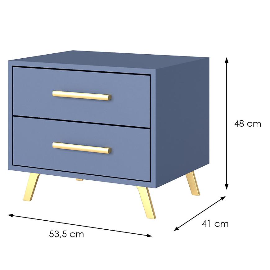 Wykonany z trwałej płyty wiórowej laminowanej w błękitnym kolorze, prezentuje się nie tylko elegancko, ale także naturalnie. Matowe wykończenie nadaje mu subtelności, a dwie szuflady zapewniają praktyczne miejsce do przechowywania niezbędnych przedmiotów.
