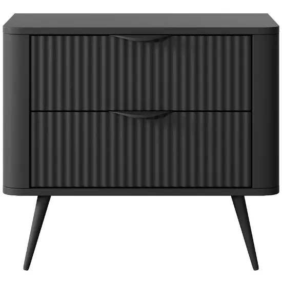 Stolik nocny Lante G 2s Czarny to nowoczesna szafka nocna łącząca minimalistyczną formę z praktycznym zastosowaniem. Całość utrzymana w głębokiej czerni nadaje stolikowi wyrazisty i elegancki charakter, a matowe wykończenie frontów i korpusu podkreśla stonowany, współczesny wygląd. Mebel doskonale komponuje się z nowoczesnymi aranżacjami, wprowadzając spójność i harmonię do wnętrza.