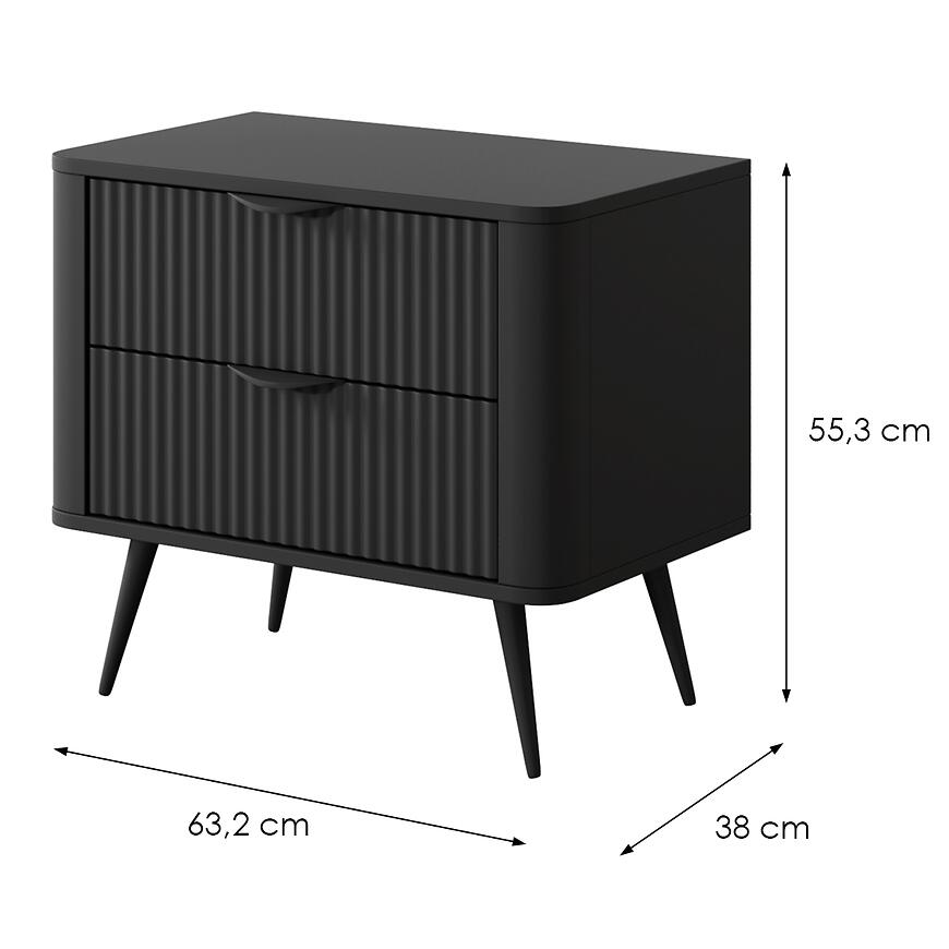 Szerokość 63,2 cm oraz głębokość 38 cm zapewniają wygodną powierzchnię użytkową przy łóżku, a dwie szuflady pozwalają utrzymać porządek w pobliżu miejsca do spania. Stabilna, niska konstrukcja stolika gwarantuje bezpieczeństwo i wygodę użytkowania.
