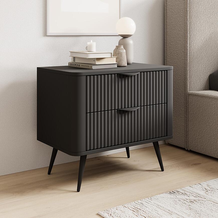 Stolik nocny Lante G 2s Czarny to nowoczesna, elegancka szafka nocna w matowej czerni. Dwuszufladowa konstrukcja, solidne materiały i minimalistyczny design kolekcji LANTE tworzą funkcjonalny, estetyczny mebel, który łączy wygodę użytkowania z nowoczesną stylistyką.