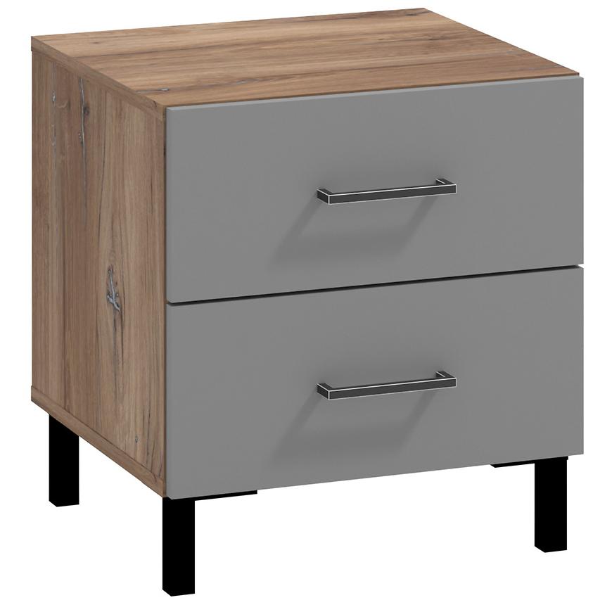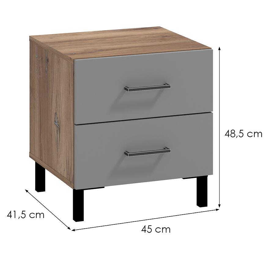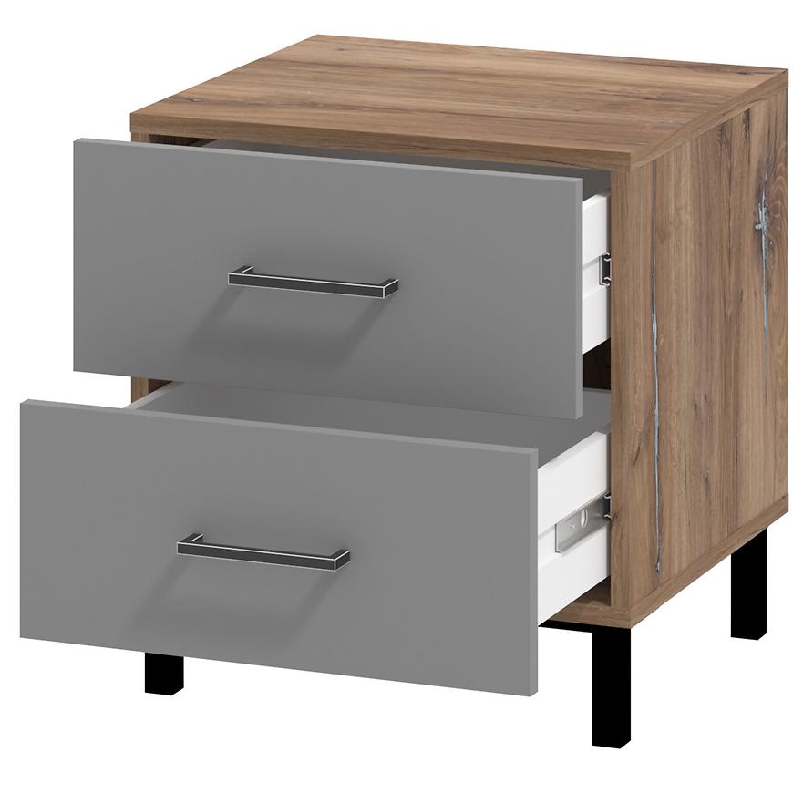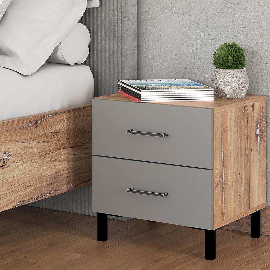 Jego kompaktowe wymiary, szerokość 45 cm, wysokość 48,5 cm i głębokość 41,5 cm, czynią go idealnym wyborem do niewielkich przestrzeni sypialnianych. Kolorystyka stolika jest harmonijna i stonowana - szary korpus z dębu masztowego ładnie współgra z frontami wykonanymi z płyty wiórowej laminowanej, które dodatkowo zostały wykończone matowym stylem.