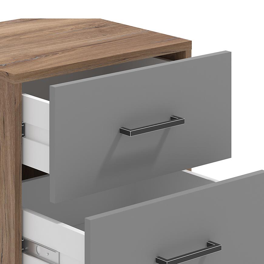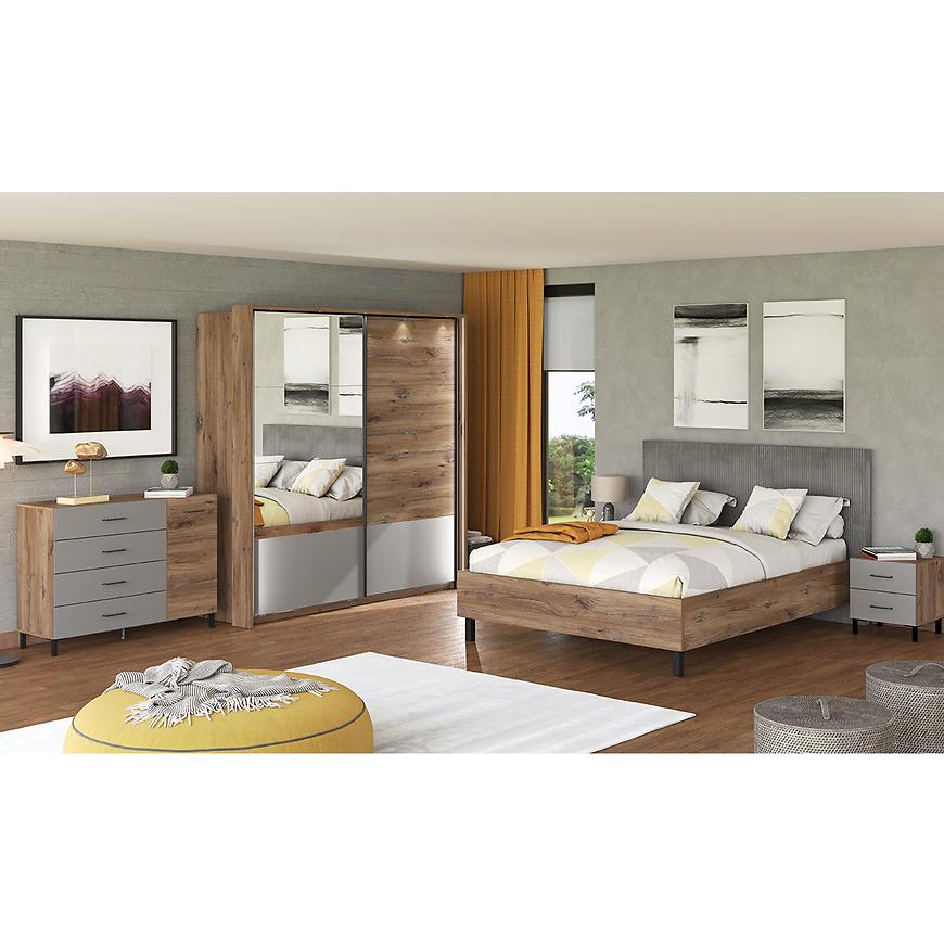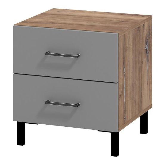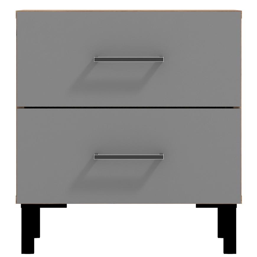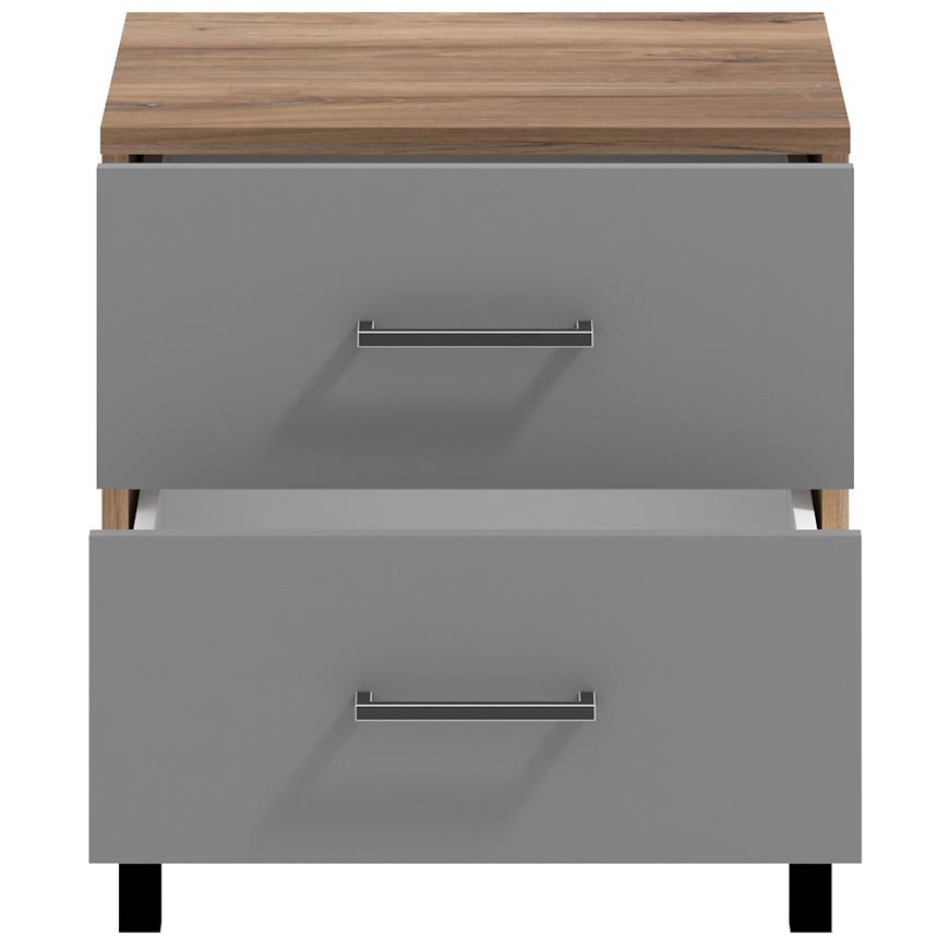 Jego kompaktowe wymiary, szerokość 45 cm, wysokość 48,5 cm i głębokość 41,5 cm, czynią go idealnym wyborem do niewielkich przestrzeni sypialnianych. Kolorystyka stolika jest harmonijna i stonowana - szary korpus z dębu masztowego ładnie współgra z frontami wykonanymi z płyty wiórowej laminowanej, które dodatkowo zostały wykończone matowym stylem.