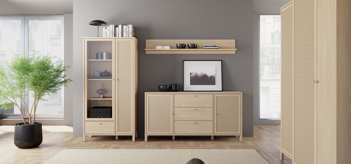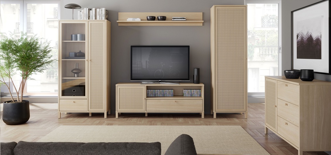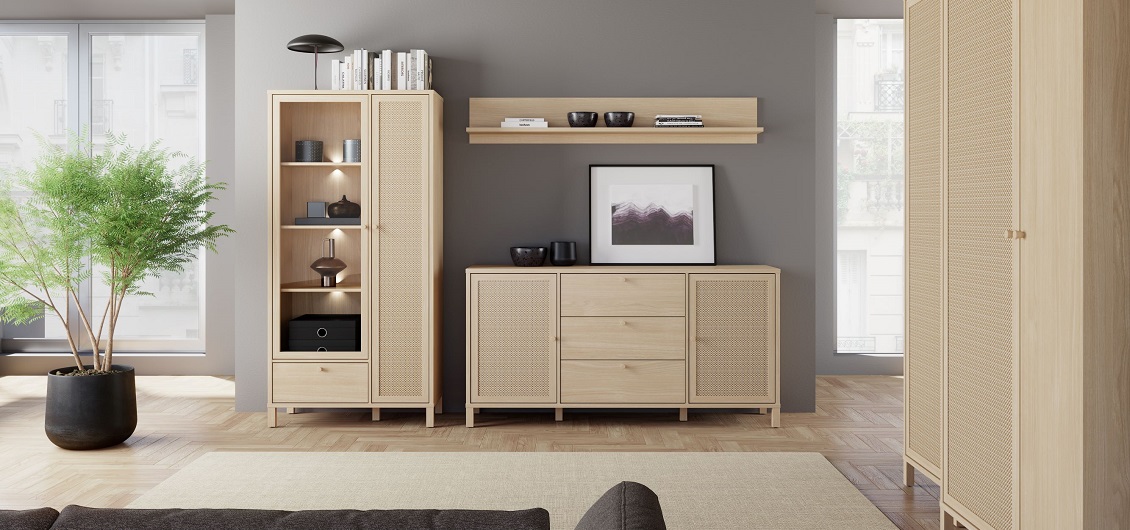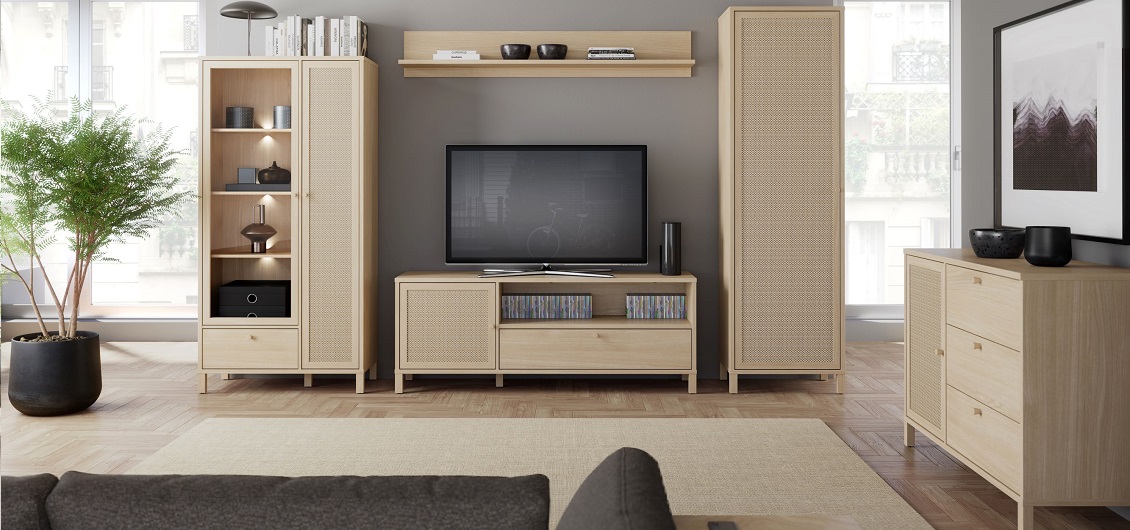 Nortado to kolekcja mebli, która łączy naturalne piękno z funkcjonalnymi rozwiązaniami, tworząc przytulną i stylową przestrzeń w Twoim salonie. Meble zostały wykonane w eleganckim dekorze dąb elegancja, który w połączeniu z rattanowymi panelami na frontach nadaje wnętrzu ciepły, naturalny charakter inspirowany stylem boho i skandynawskim minimalizmem.