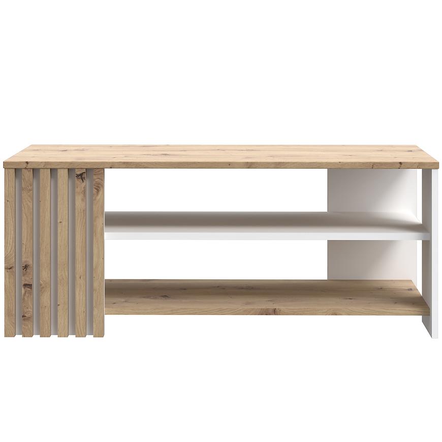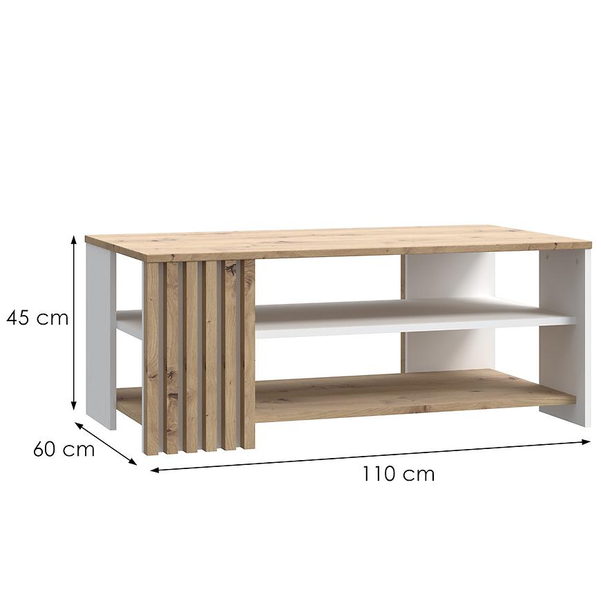 Stolik okolicznościowy Zaandam 60x110 w kolorystyce Biały / Dąb Artisan to elegancki i praktyczny mebel, który doskonale sprawdzi się w salonie jako stolik kawowy lub pomocniczy. Prostokątny blat o wymiarach 60x110 cm zapewnia wygodną przestrzeń do serwowania napojów, eksponowania dekoracji czy codziennego użytku. Połączenie czystej bieli z ciepłym odcieniem dębu artisan tworzy nowoczesne i jednocześnie przytulne zestawienie, pasujące zarówno do jasnych, jak i kontrastowych wnętrz. Solidne wykonanie oraz stabilna konstrukcja gwarantują trwałość i komfort użytkowania. Stolik Zaandam to stylowe i funkcjonalne uzupełnienie każdej przestrzeni dziennej – idealny dla osób ceniących prostotę, estetykę i praktyczne rozwiązania.