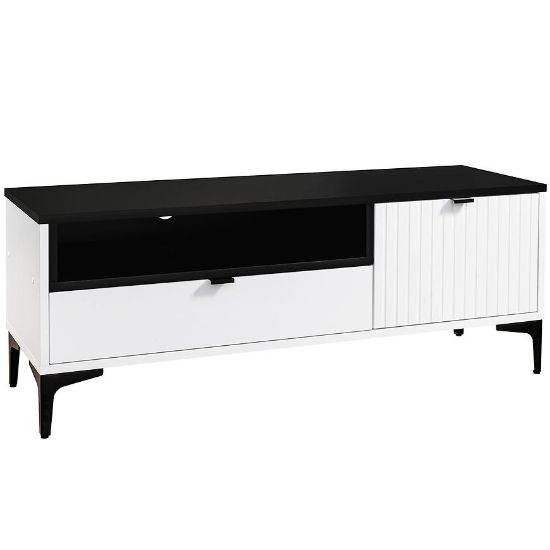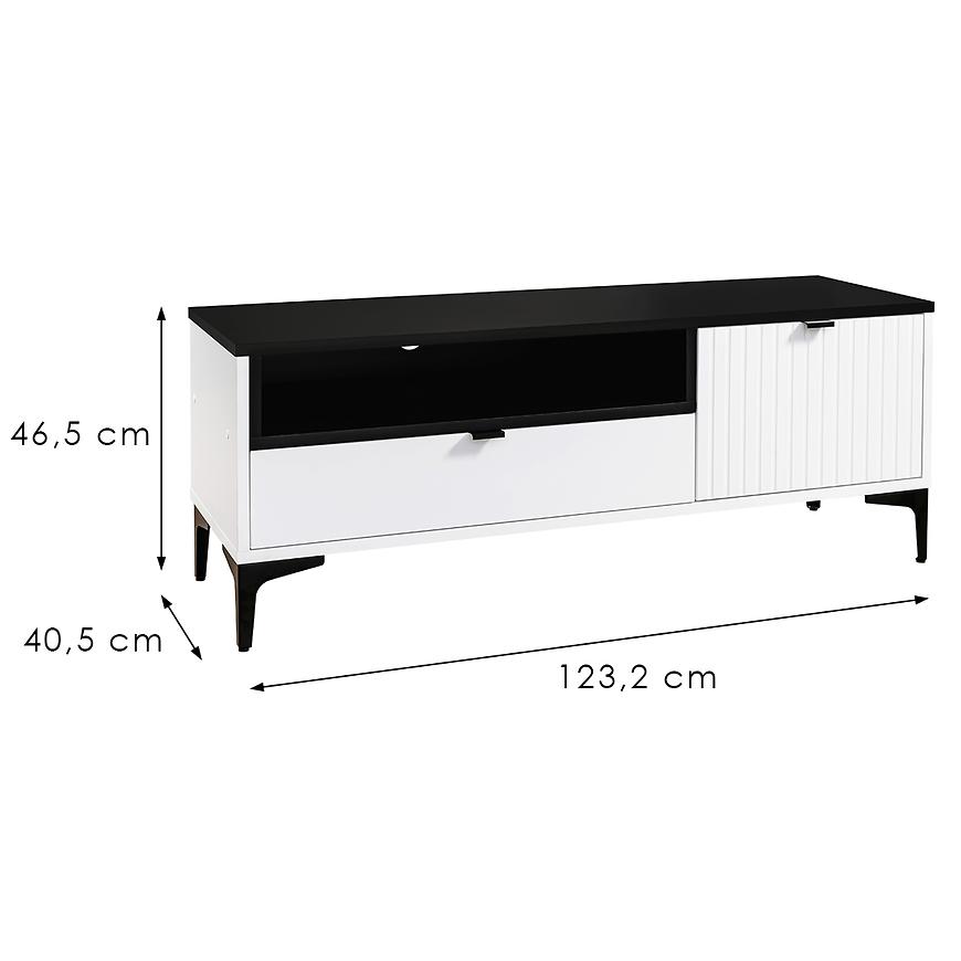 Stolik RTV Fabio 1D1S blat czarny to idealne rozwiązanie dla osób poszukujących nowoczesnego i funkcjonalnego mebla, który doskonale wpasuje się w każdy współczesny salon. O wysokości 46,5 cm, szerokości 123,2 cm oraz głębokości 40,5 cm, ten praktyczny stolik nie tylko pomieści telewizor, ale także stanie się eleganckim elementem dekoracyjnym w Twoim wnętrzu. Jego minimalistyczny design w biało-czarnym kolorze sprawia, że jest uniwersalny i łatwo komponuje się z różnymi stylami aranżacyjnymi, od skandynawskiego po industrialny.