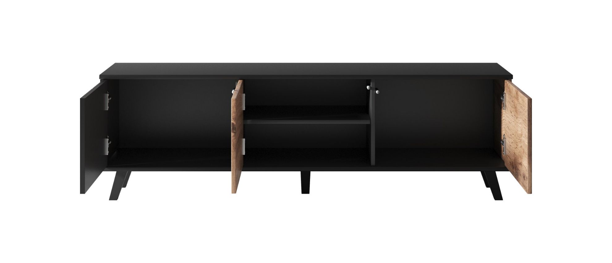 Trzydrzwiowa konstrukcja stolika umożliwia praktyczne ukrywanie różnorodnych przedmiotów, zachowując jednocześnie porządek w pomieszczeniu. Wnętrze stolika zostało zaprojektowane z myślą o funkcjonalności, umożliwiając uporządkowane rozmieszczenie kabli oraz sprzętów audio-wideo. Dodatkowym atutem jest możliwość wyboru stron drzwi podczas montażu, co pozwala dostosować ją do indywidualnych preferencji i układu pomieszczenia.