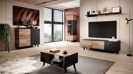 Materiały użyte do produkcji stolika zapewniają wysoką jakość i trwałość. Front wykonany jest z MDF-u okleinowanego dębem wotan, co nadaje meblowi naturalnego charakteru. Korpus z płyty meblowej, pokryte są okleiną oraz polipropylenu dodają lekkości i nowoczesności. Kombinacja kolorów, łącząca dąb wotan z eleganckim, matowym czarnym, nadaje meblowi wyjątkowego uroku, który świetnie komponuje się z różnymi stylami aranżacyjnymi.