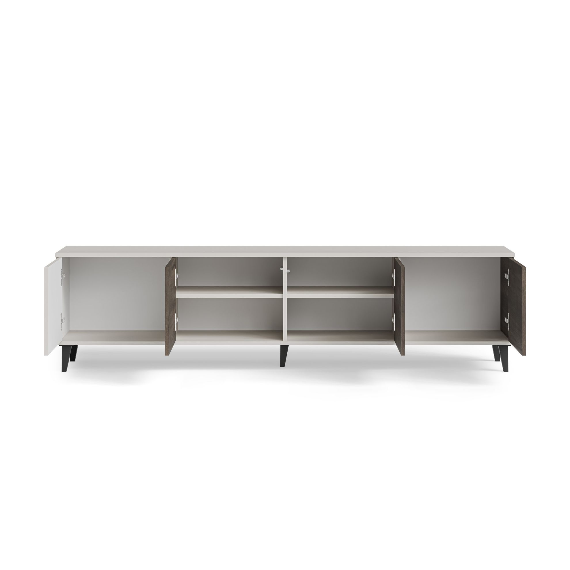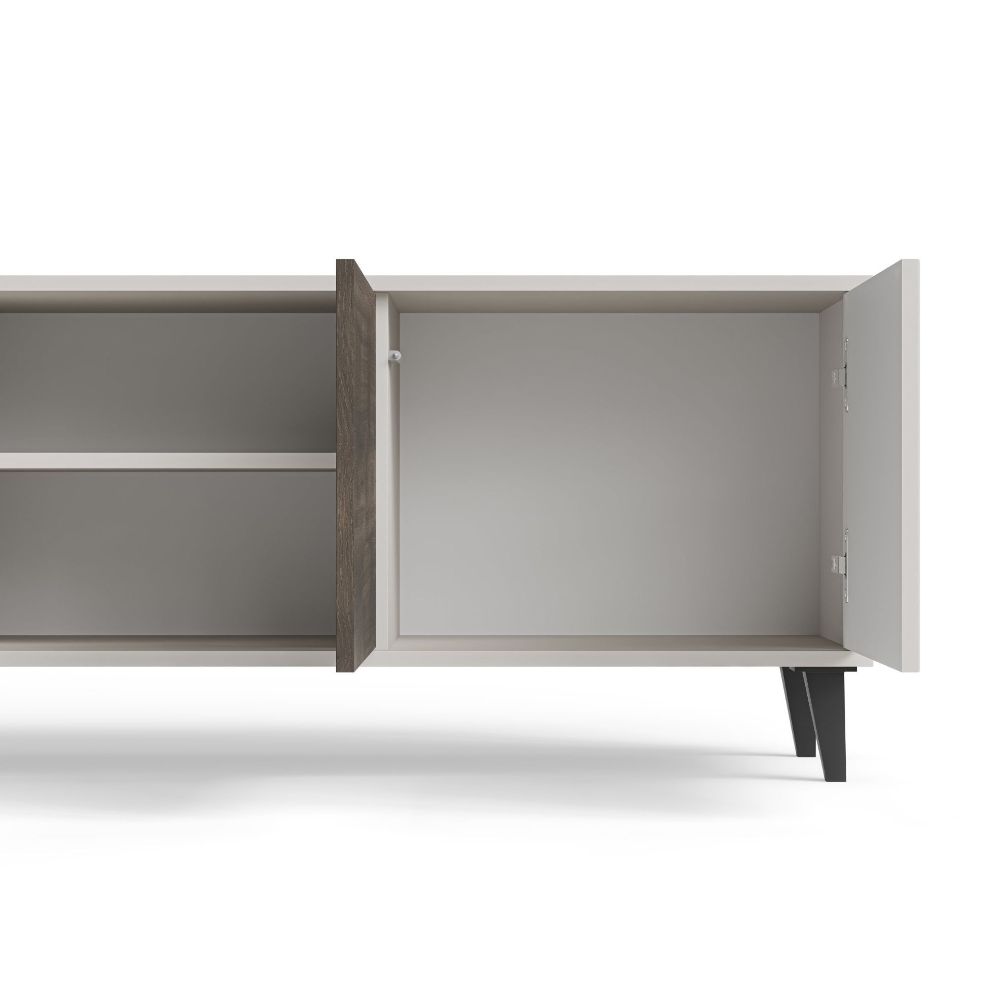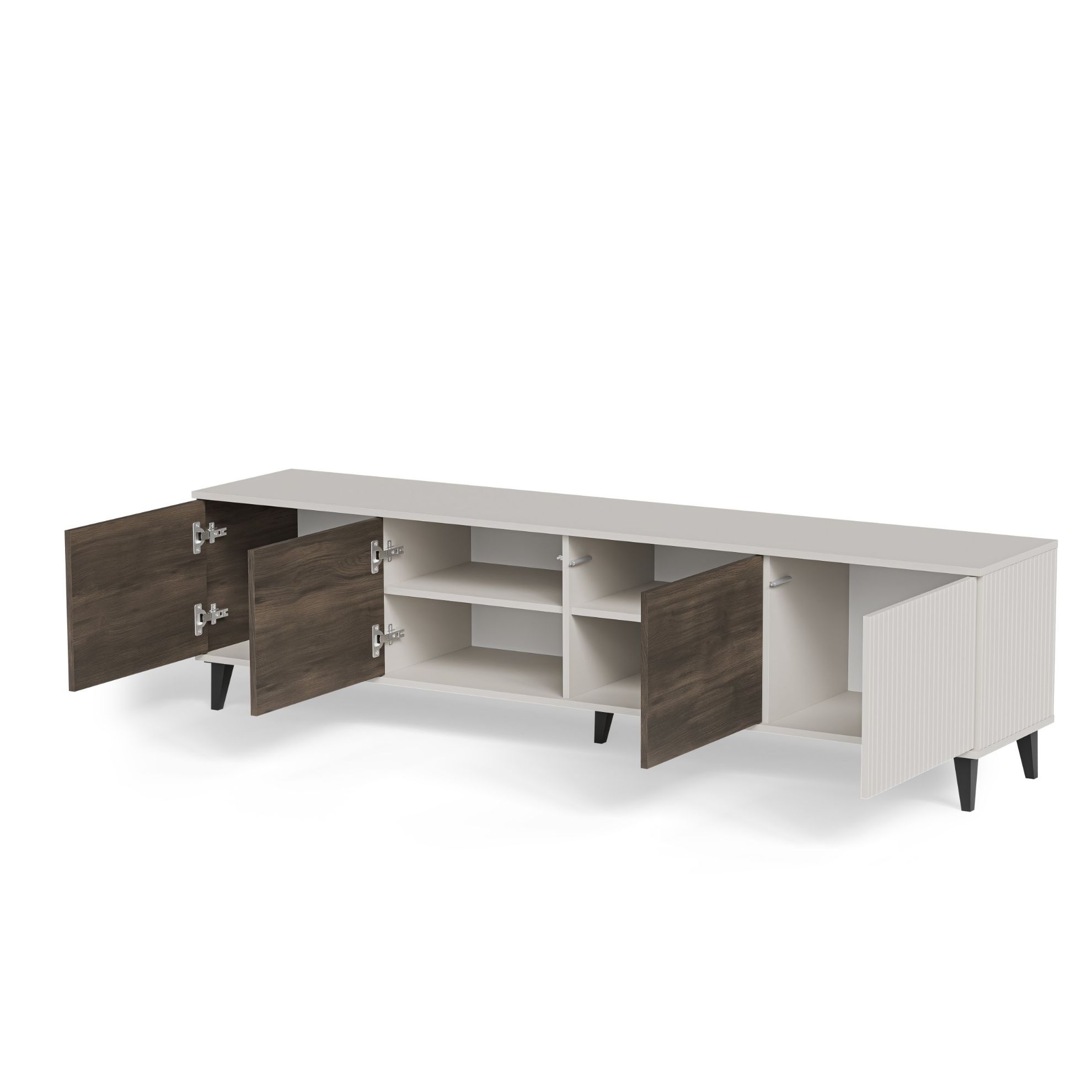 Czterodrzwiowa konstrukcja stolika umożliwia praktyczne ukrywanie różnorodnych przedmiotów, zachowując jednocześnie porządek w pomieszczeniu. Wnętrze stolika zostało zaprojektowane z myślą o funkcjonalności, umożliwiając uporządkowane rozmieszczenie kabli oraz sprzętów audio-wideo. Dodatkowym atutem jest możliwość wyboru stron drzwi podczas montażu, co pozwala dostosować ją do indywidualnych preferencji i układu pomieszczenia.
