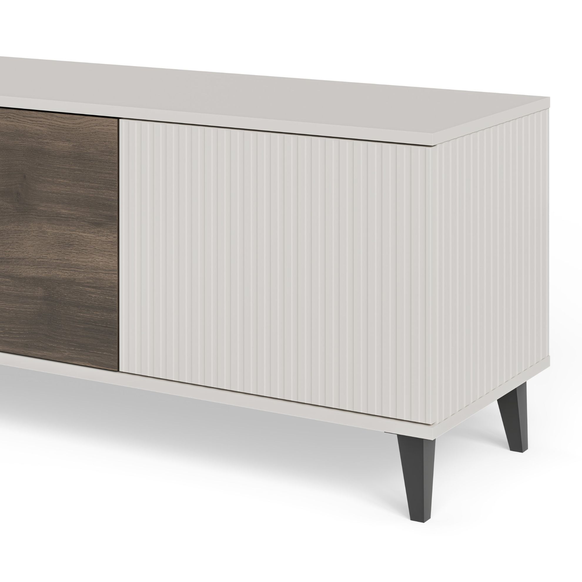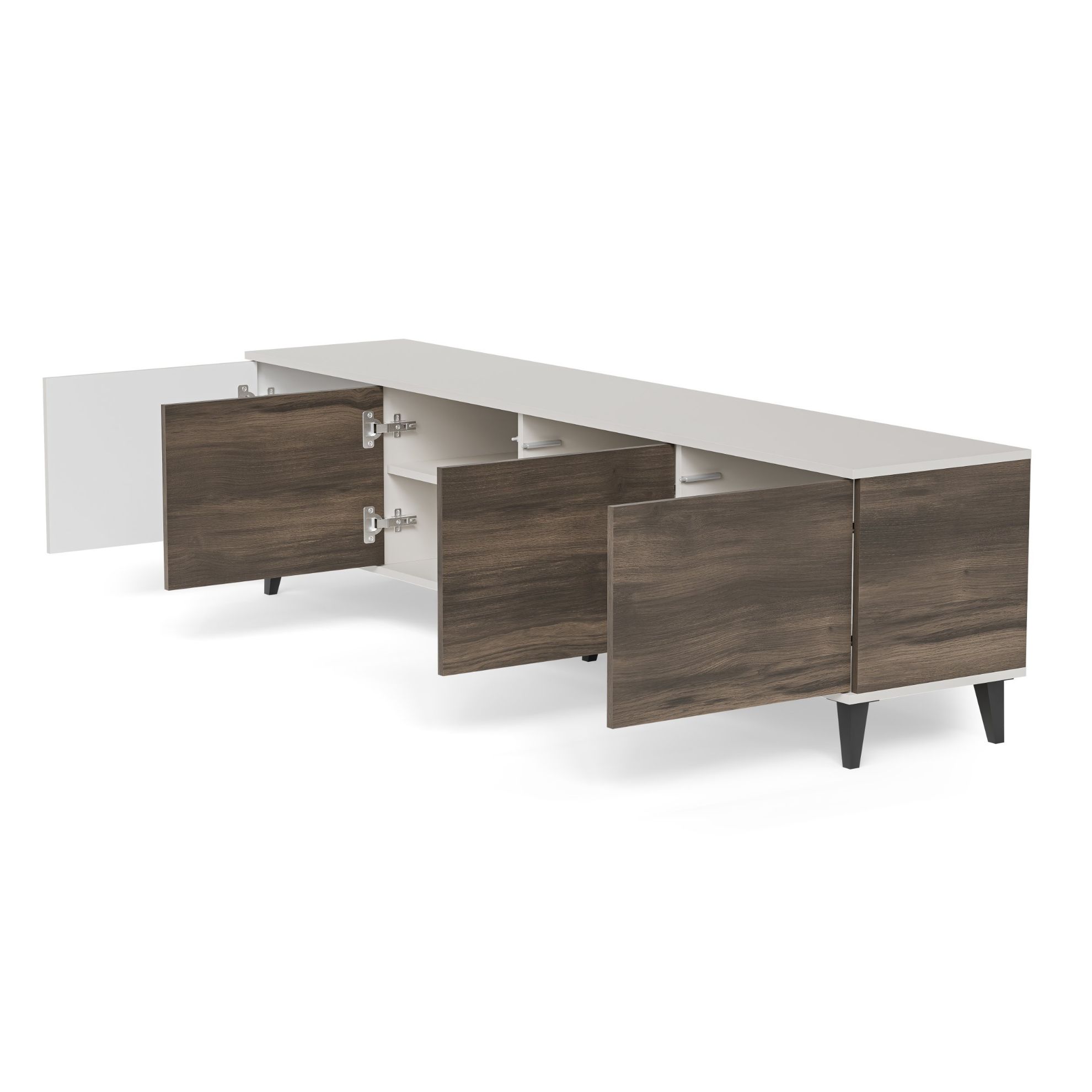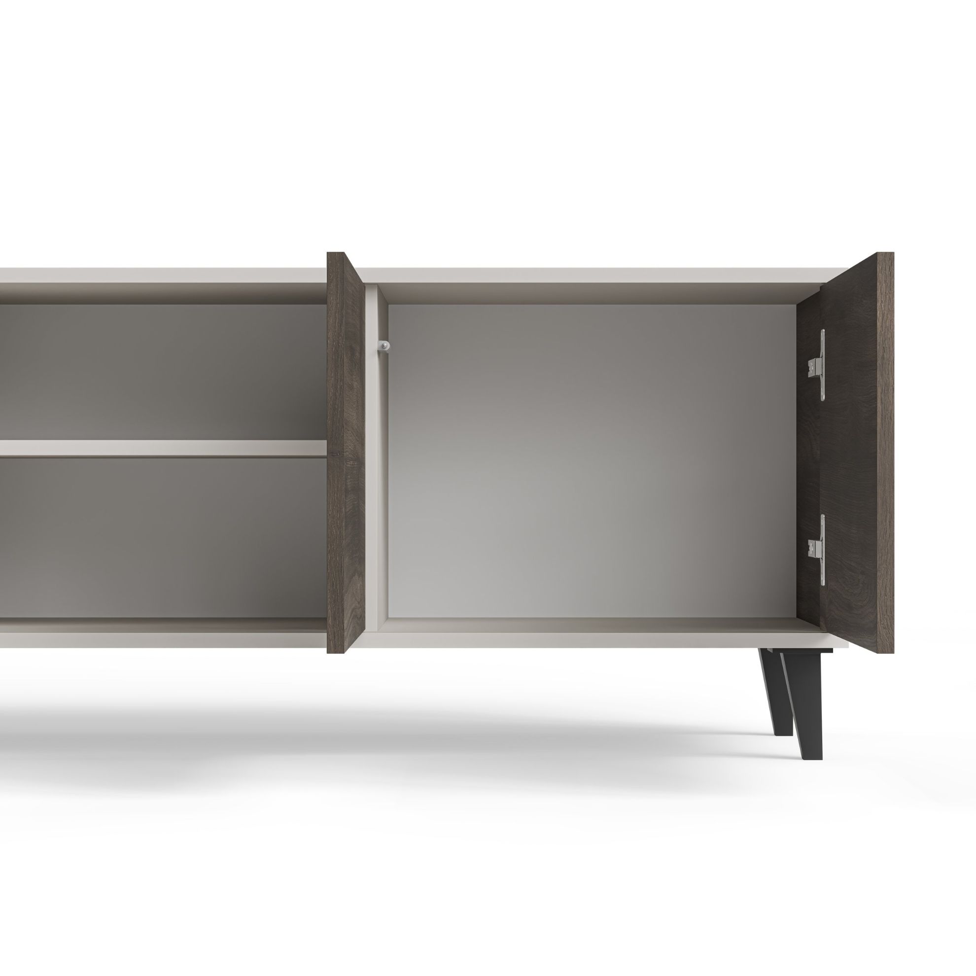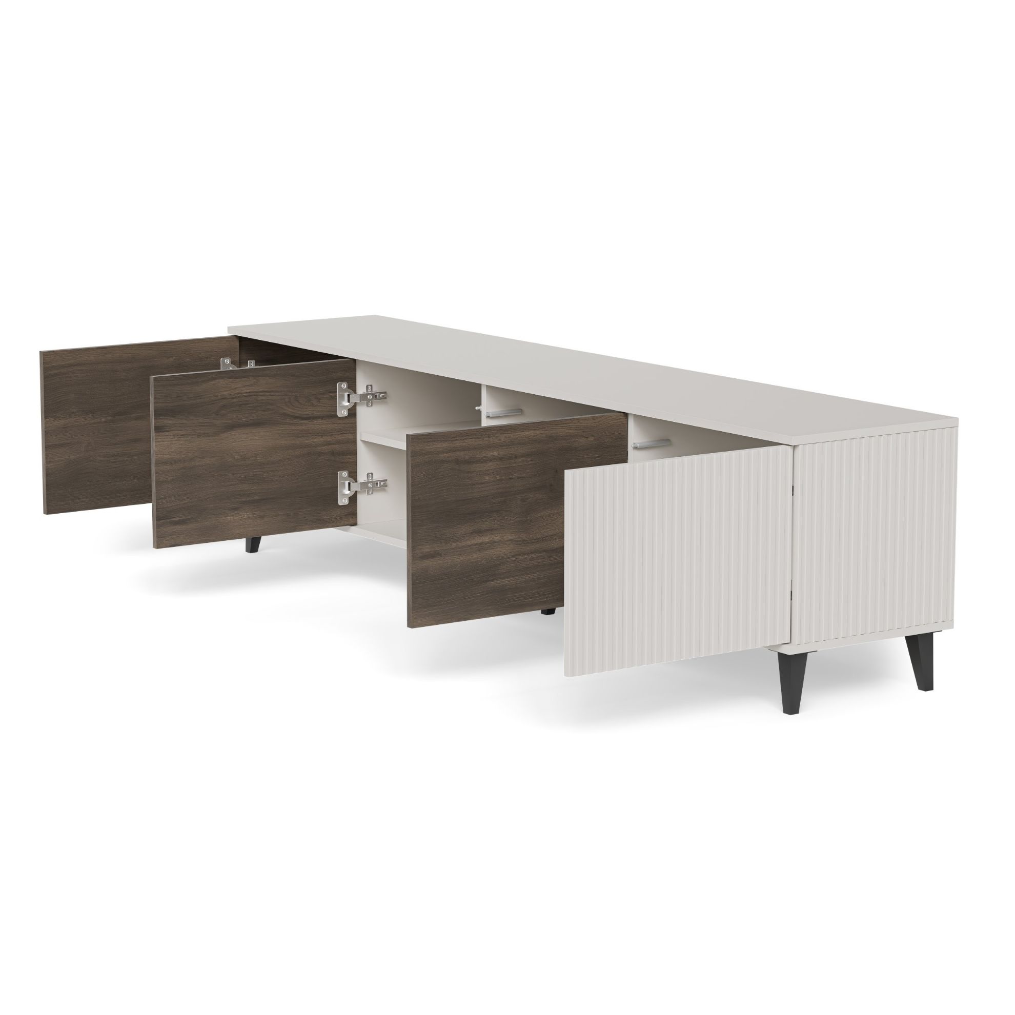 Czterodrzwiowa konstrukcja stolika umożliwia praktyczne ukrywanie różnorodnych przedmiotów, zachowując jednocześnie porządek w pomieszczeniu. Wnętrze stolika zostało zaprojektowane z myślą o funkcjonalności, umożliwiając uporządkowane rozmieszczenie kabli oraz sprzętów audio-wideo. Dodatkowym atutem jest możliwość wyboru stron drzwi podczas montażu, co pozwala dostosować ją do indywidualnych preferencji i układu pomieszczenia.