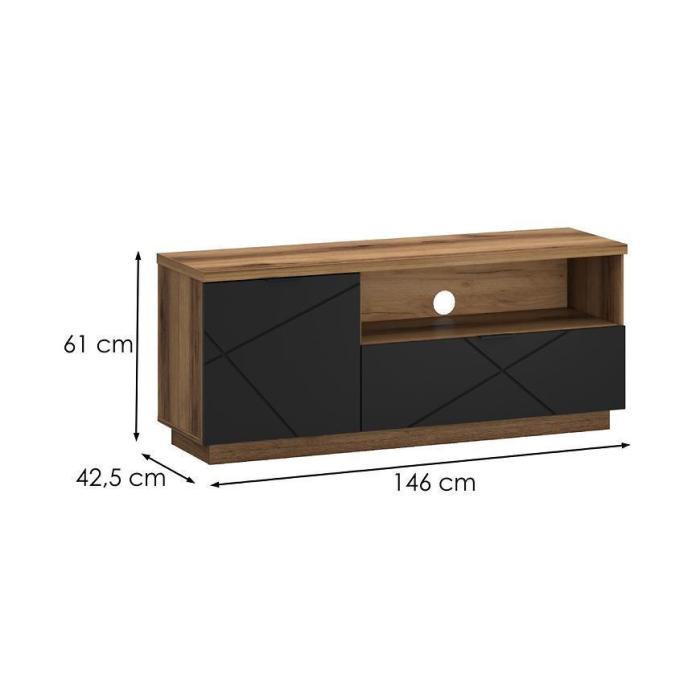 Stolik RTV Orient B 1d1d Dąb Delano Ciemny/Czarny to propozycja dla osób szukających nowoczesnego mebla do salonu, który łączy estetykę z funkcjonalnością. Ciemne wybarwienie dąb delano w połączeniu z matowymi czarnymi frontami nadaje wnętrzu elegancki charakter i wpisuje się w nowoczesne aranżacje wnętrz.