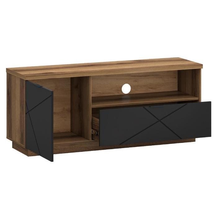 Stolik RTV Orient B 1d1d wyposażony jest w jedno drzwi i jedną szufladę. Takie rozwiązanie pozwala na przechowywanie sprzętu RTV, pilotów, kabli oraz innych akcesoriów w schludny i uporządkowany sposób. Szuflada i drzwi ułatwiają szybki dostęp do zawartości, a jednocześnie chronią ją przed kurzem.