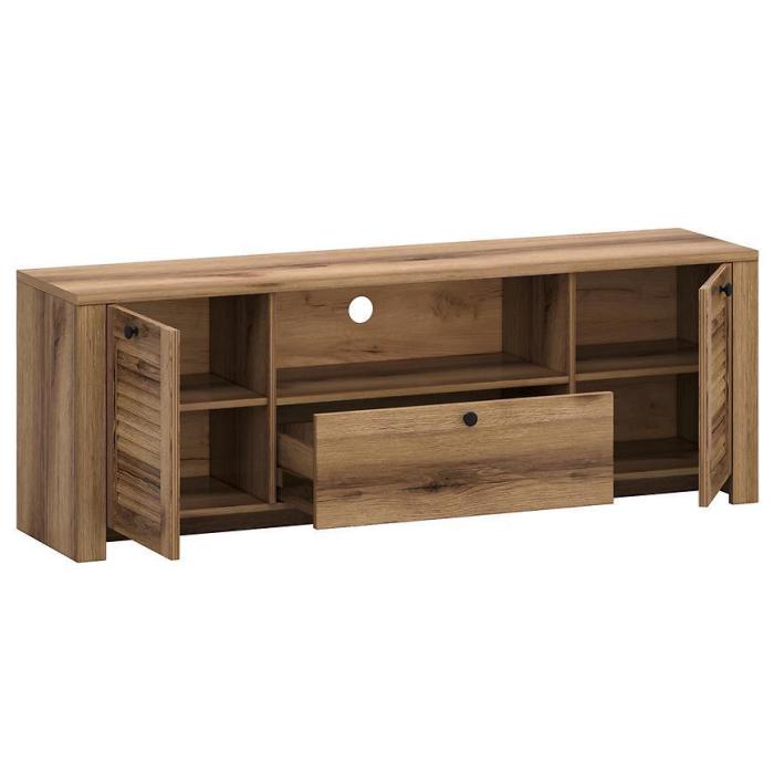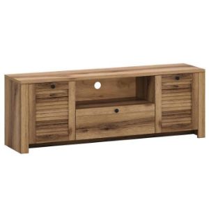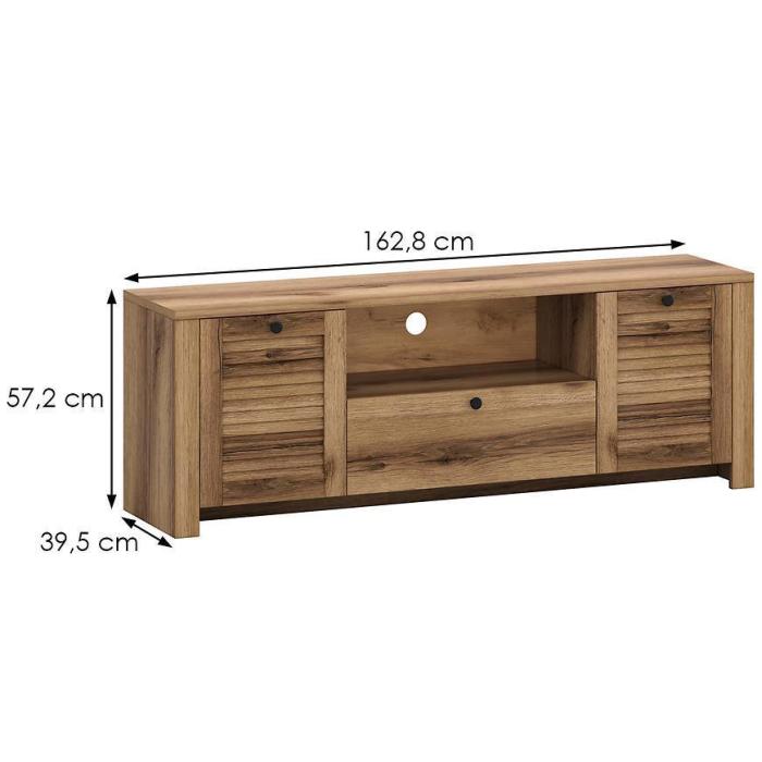 Szafka RTV Sevilla B ma szerokość 162,8 cm, głębokość 39,5 cm oraz wysokość 57,2 cm. Dzięki tym wymiarom oferuje sporo miejsca na telewizor oraz sprzęt multimedialny, jednocześnie nie przytłaczając przestrzeni. Konstrukcja obejmuje 2 drzwi oraz 1 szufladę, które pozwalają w prosty sposób utrzymać porządek i schować niezbędne akcesoria.