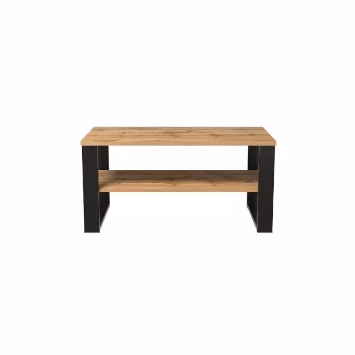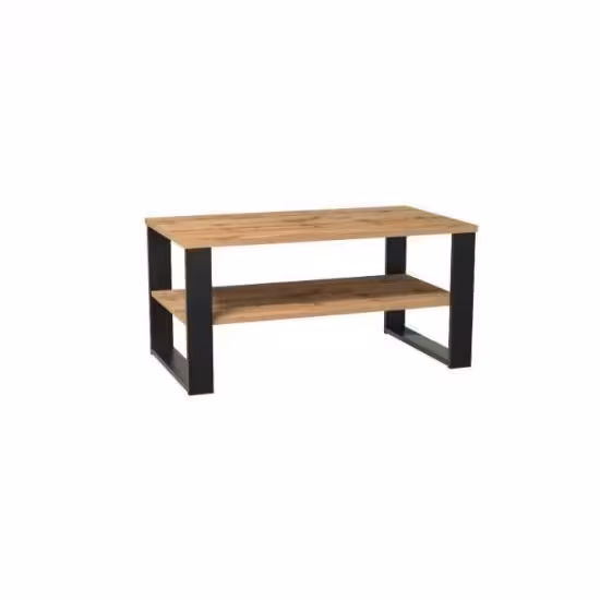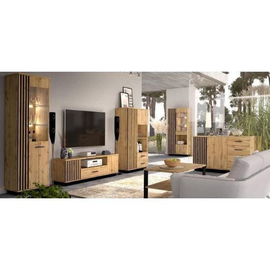 Korpus systemu wykonany jest w kolorze dąb wotan, natomiast fronty to połączenie dąb wotan z czarnym matem, które doskonale ze sobą współgrają. Lamele zastosowane na frontach wykonano z płyty MDF.